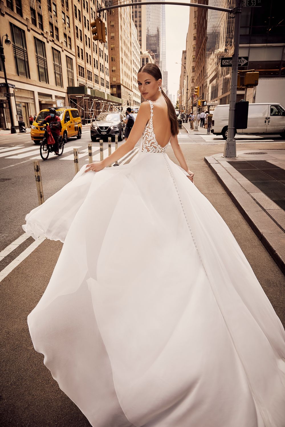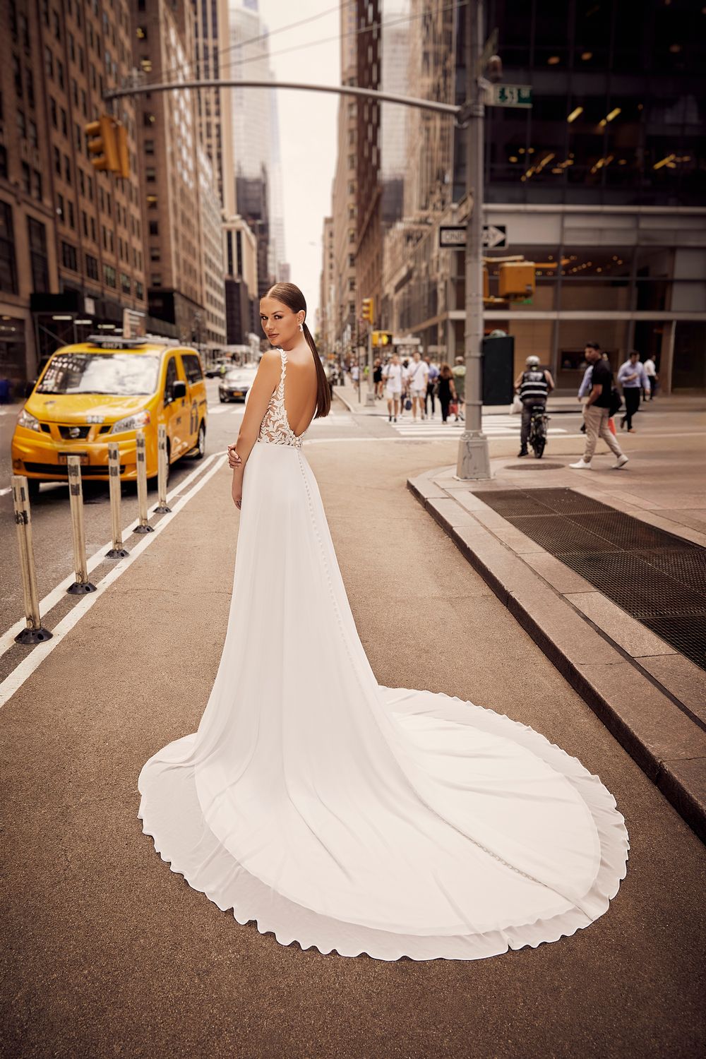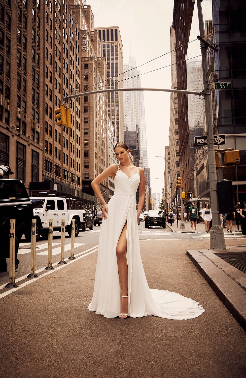Deze prachtige trouwjurk zal je zeker laten stralen op je speciale dag. Het prachtige silhouet zal je figuur complimenteren. De sweetheart halslijn accentueert je decolleté terwijl het aansluitende lijfje je rondingen op de juiste manier omarmt. De halslijn is subtiel afgewerkt met kant dat doorloopt in de schouderbandjes. De overslag van de jurk geeft een hoge loopsplit en de rok vloeit uit in een waanzinnige sleep.