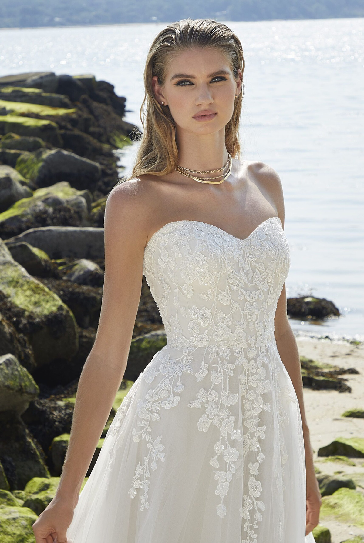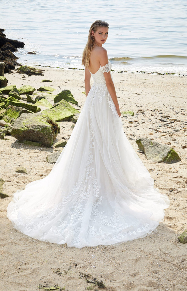 Mooie bruidsjurk van tule met bloemig kanten borduurwerk met een A-lijn silhouet en een sweetheart halslijn. De afneembare off-shoulder mouw in geborduurd bloemenkant voegt charme toe aan deze trouwjurk, compleet met knoopjes die de lage rug versieren, een hoge split aan de zijkant, en een sleep versiert met kant.