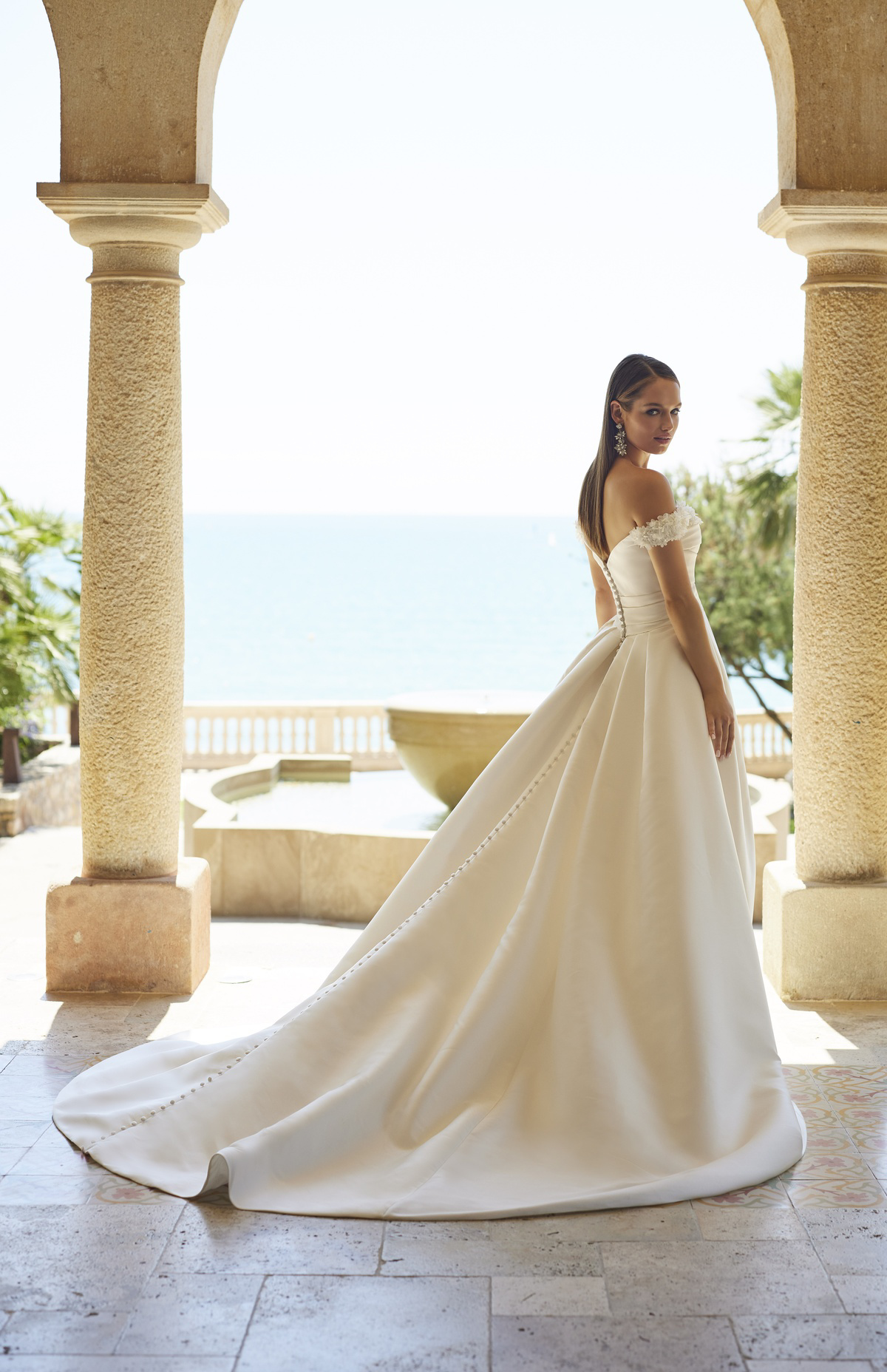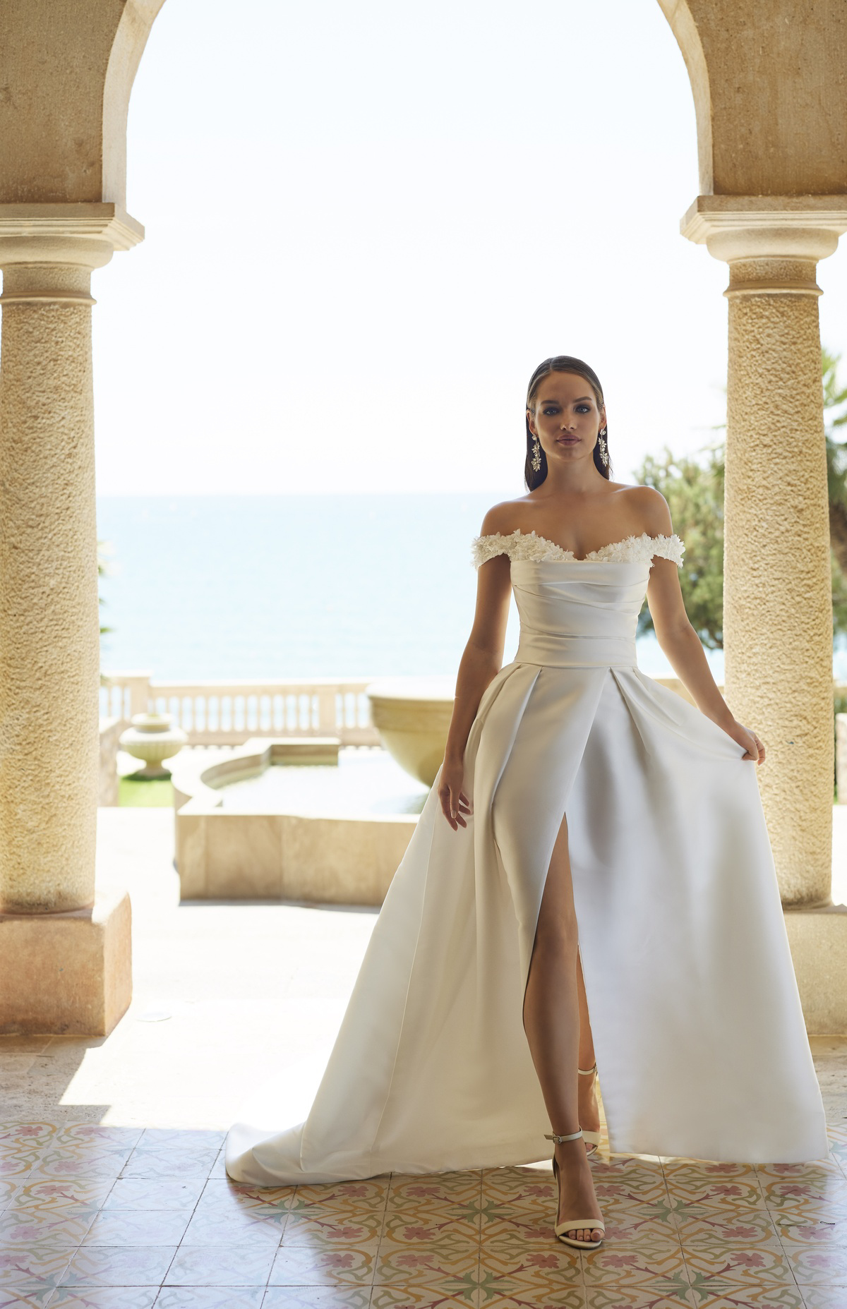 Deze A-lijn jurk van Morilee is gemaakt van Mikado. Het gedrapeerde lijfje loopt mooi over in de sweetheart halslijn. De off shoulder lijn is mooi afgewerkt met 3D bloemen, applicaties en kralen. De split die tevoorschijn komt tussen de plooien in de rok geeft een sexy toevoeging aan deze elegante en romantische jurk. Verder heeft deze jurk knoopjes op de rug zitten die doorlopen in de mooie sleep.