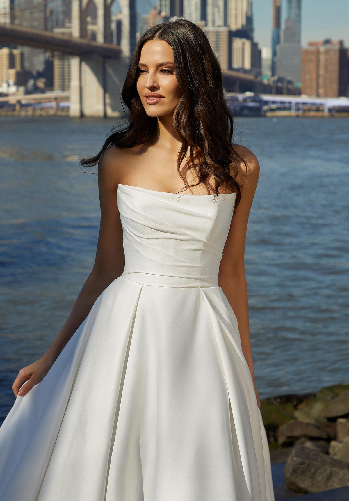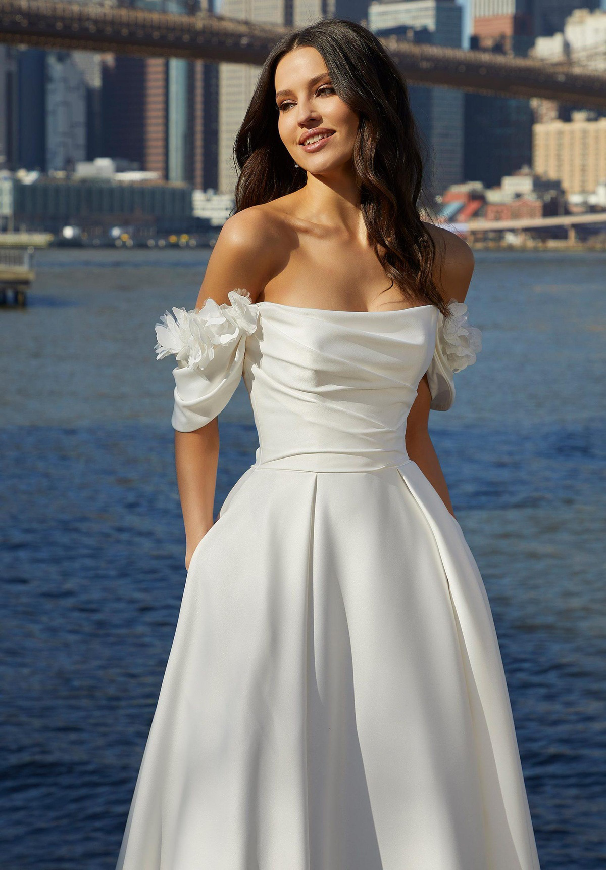 Deze elegante A-lijn trouwjurk heeft gedrapeerde details op de rechte halslijn van het lijf en off-the-shoulder mouwtjes met 3D bloemen van Duchess satijn. Een prachtige keuze voor de bruid die op zoek is naar een mix van klassiek en modern.