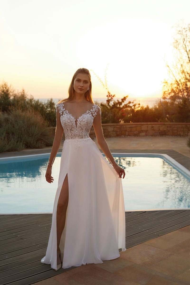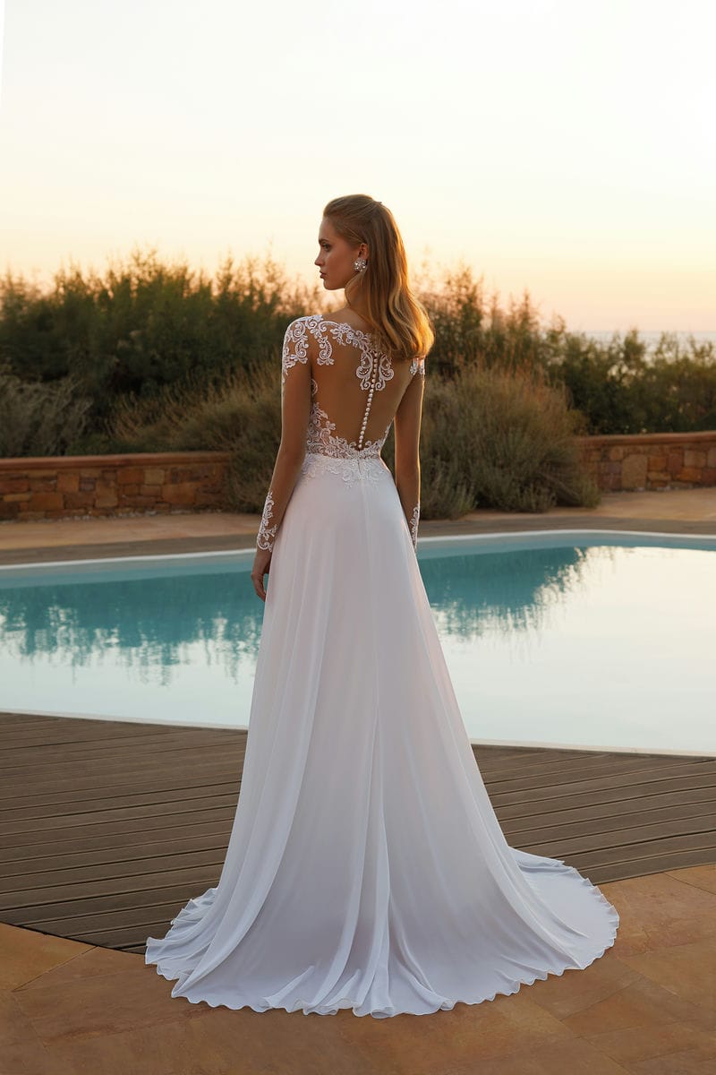 Ben je op zoek naar een trouwjurk met subtiele lange mouwen? Dan is dit jouw jurk! De mouwen zijn gemaakt van een tule stof waar kanten applicaties op geborduurd zijn. Het lijfje met een V-hals en de see through rug zijn versierd met prachtige kanten applicaties. De loopsplit in de chiffon rok maakt deze jurk uiterst geschikt voor een zonnige bruiloft op het strand.