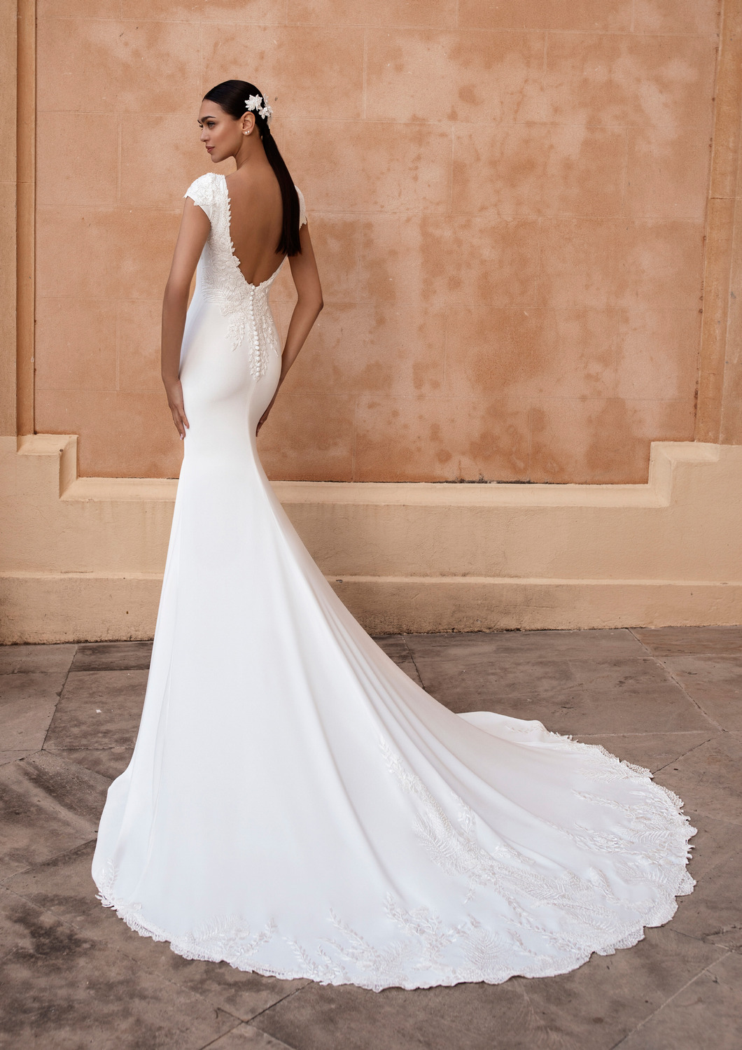 Fantastische minimalistische trouwjurk die ook tijdloos is! Deze jurk heeft een elegante hoge boothals wat een mooi contrast geeft met de laag uitgesneden rug. Langs de kapmouwtjes, rug en sleep lopen subtiele kanten decoraties. Voor de bruid die zich elegant, chic en gracieus wilt voelen moet je zeker deze jurk eens komen passen bij ons in de winkel!