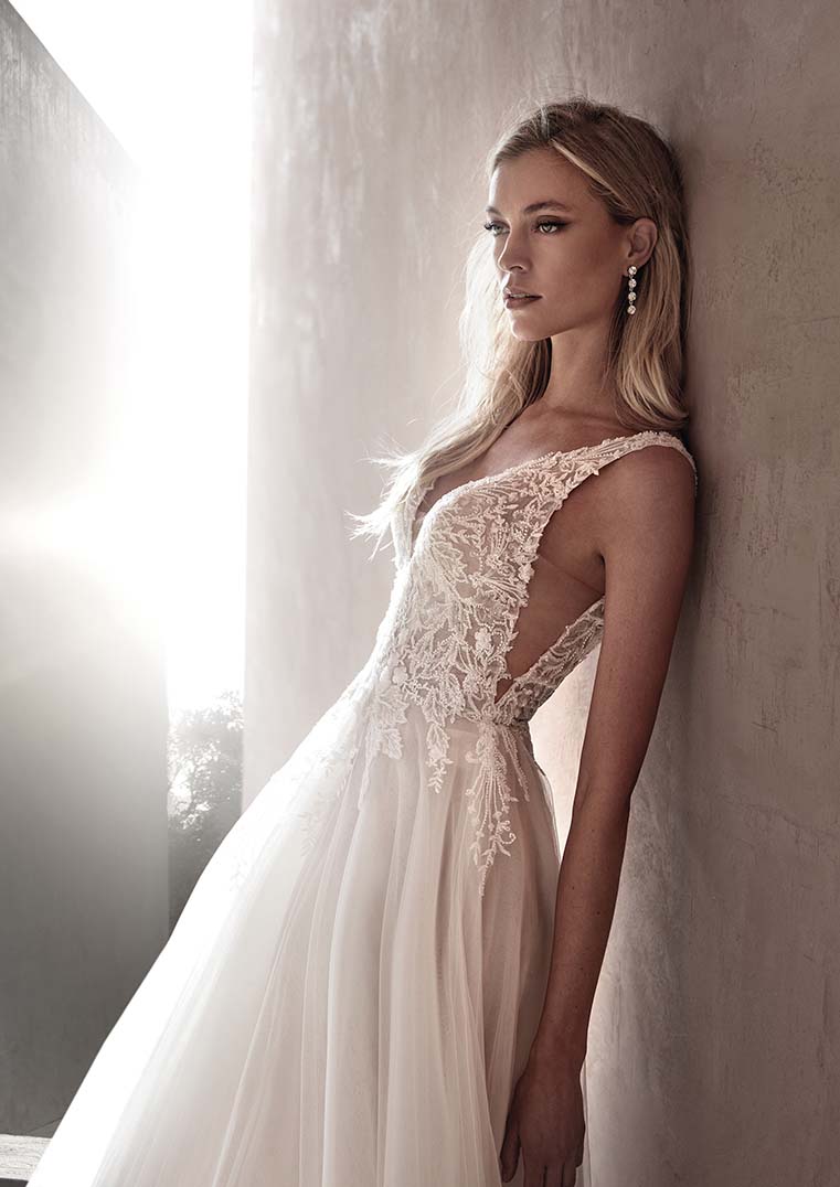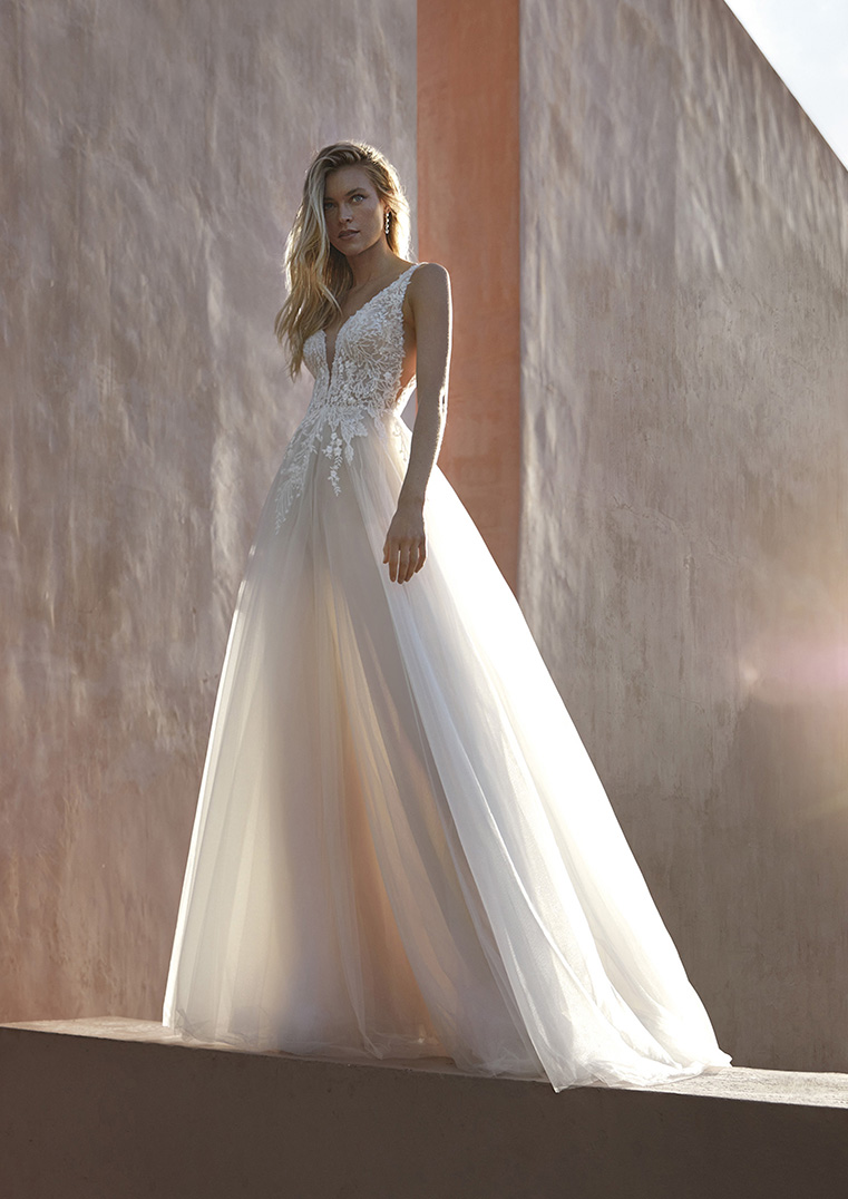 Een prachtige bruidsuitstraling creëer je met de Crimson van Pronovias. De jurk heeft een transparante tule rok en een illusie lijfje versierd met kanten applicaties. De diepe V-hals, lage rug en see through zijpanelen maken de jurk flirterig. De jurk is gemaakt van dunne lage tule waarin je silhouet prachtig te zien is.
