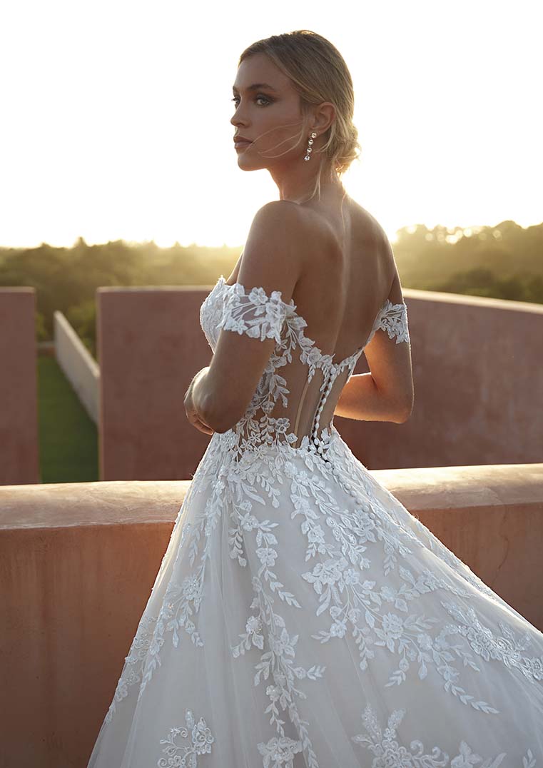Elysees is een klassieke A-lijn jurk met off-shoulder mouwtjes van bloemenkant. Het halfdoorzichtige lijfje heeft een sweetheart halslijn en een diepe V-hals. De kanten applicaties versieren de hele rok en de prachtige lange sleep. Een ideale jurk voor een bruiloft op bijvoorbeeld een landgoed.