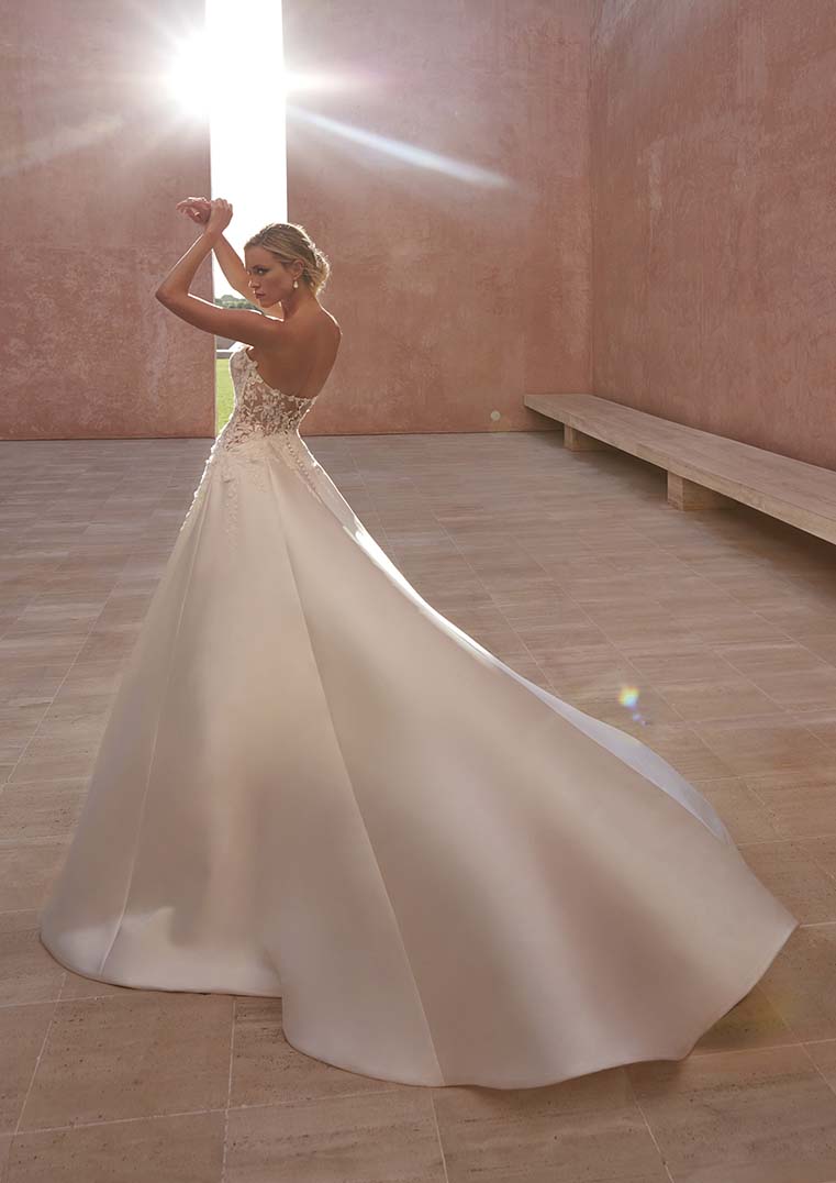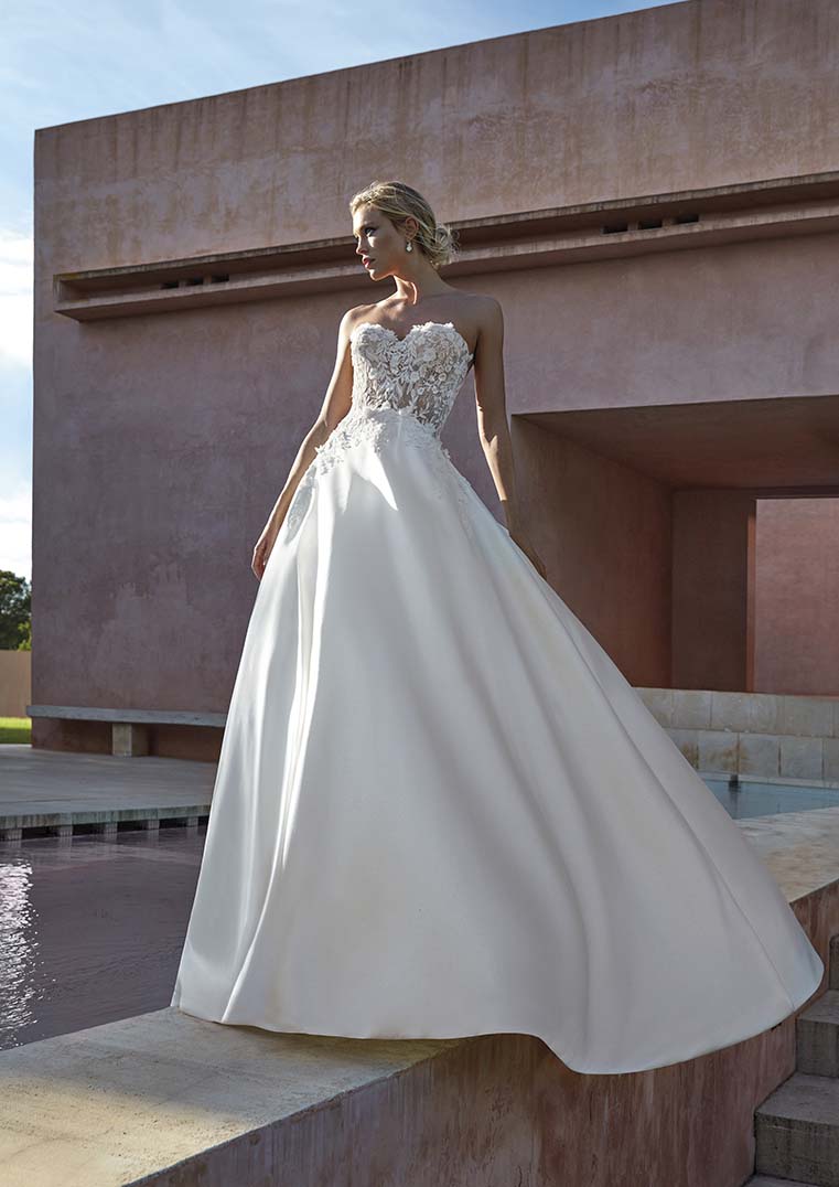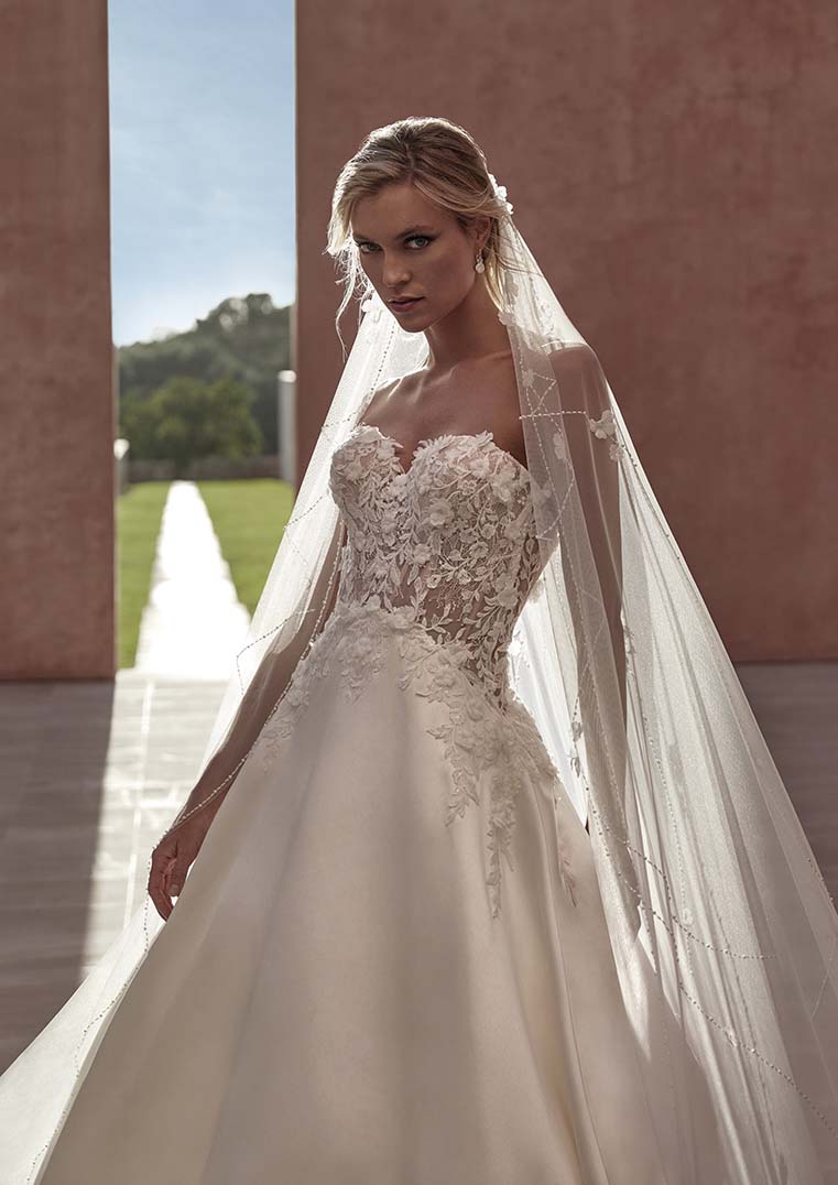Deze trouwjurk is de Floridia van Pronovias. De jurk is gemaakt van een zijden mikado wat ervoor zorgt dat de A-lijn rok prachtig meebeweegt. Het aansluitende bovenlijfje met een sweetheart halslijn is bedekt met bijzondere kanten applicaties die een driemensionaal effect geven. De jurk heeft waanzinnige sleep die een blijvende indruk maakt. Een prachtige jurk voor een bruiloft in een kasteel of op een landgoed.