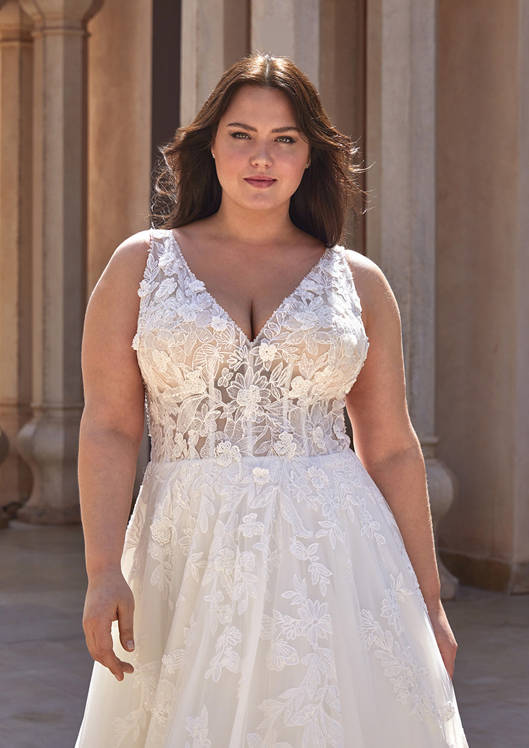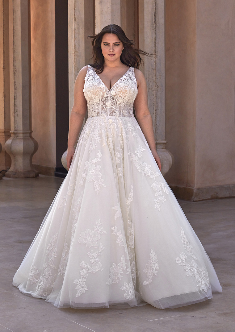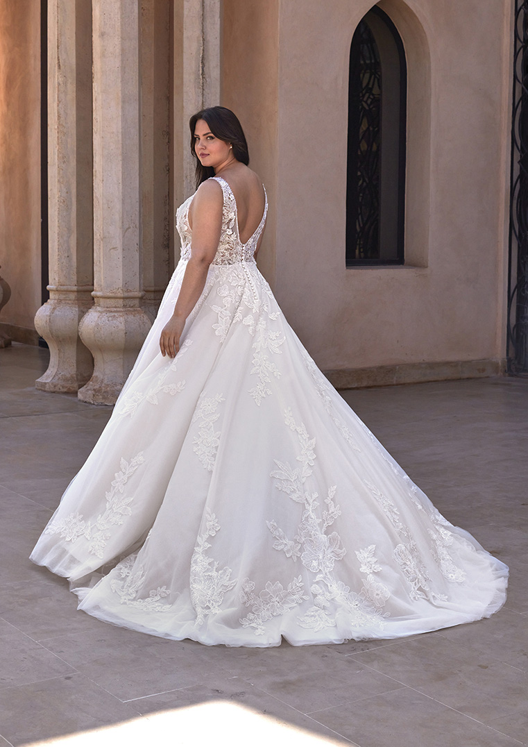 Deze A-lijn jurk is een dromerige trouwjurk ontworpen door Pronovias. De combinatie van tule, kant en kralen zorgt voor een romantische en verfijnde uitstraling. Het see through lijfje is bedekt met mooie kanten applicaties en heeft baleinen die zorgen voor een goede pasvorm. De jurk heeft een V-hals, zijuitsparingen van tule en een diepe rug. Deze jurk is perfect voor bruiden die op zoek zijn naar tijdloze elegantie met een vleugje subtiel detail.