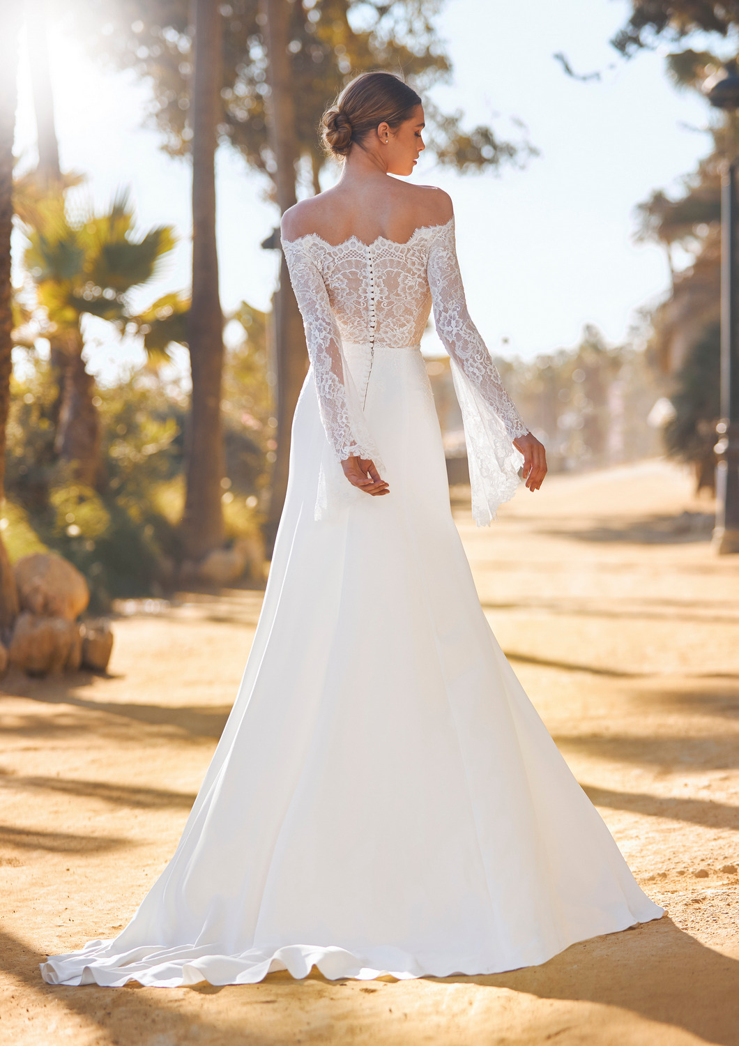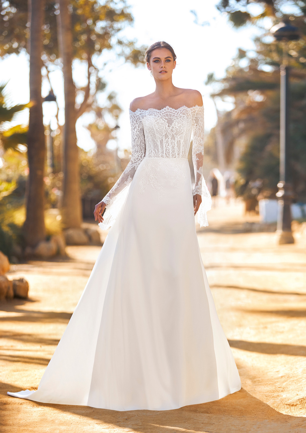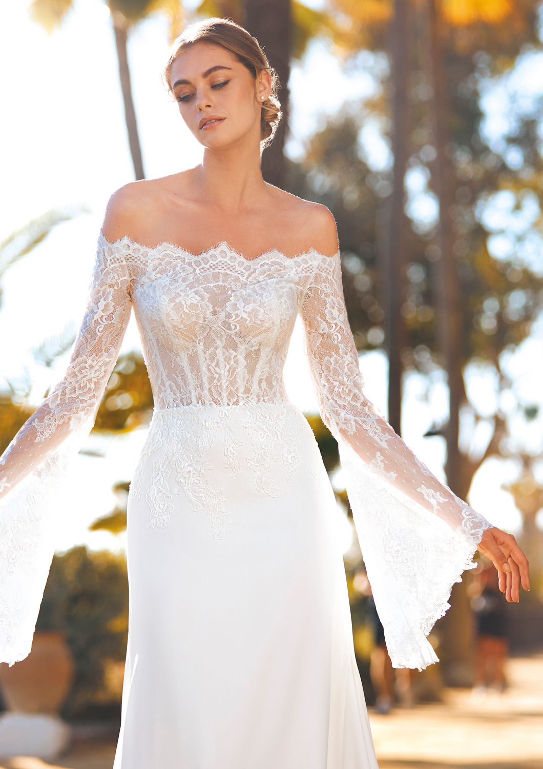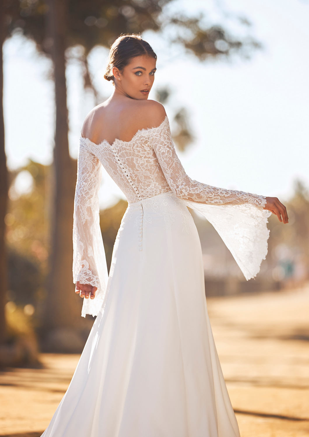 Koninklijk als een prinses, met een prachtige geschulpte off shoulder halslijn. Het lijfje is doorzichtig en heeft een illusie korset wat een sexy touch geeft. De lange uitlopende klokmouwen geven een speels effect aan deze fantastische trouwjurk van Pronovias. De effen wijd uitlopende rok is in mooi contrast met de met kant beklede top. Geschikt voor alle bruiden!