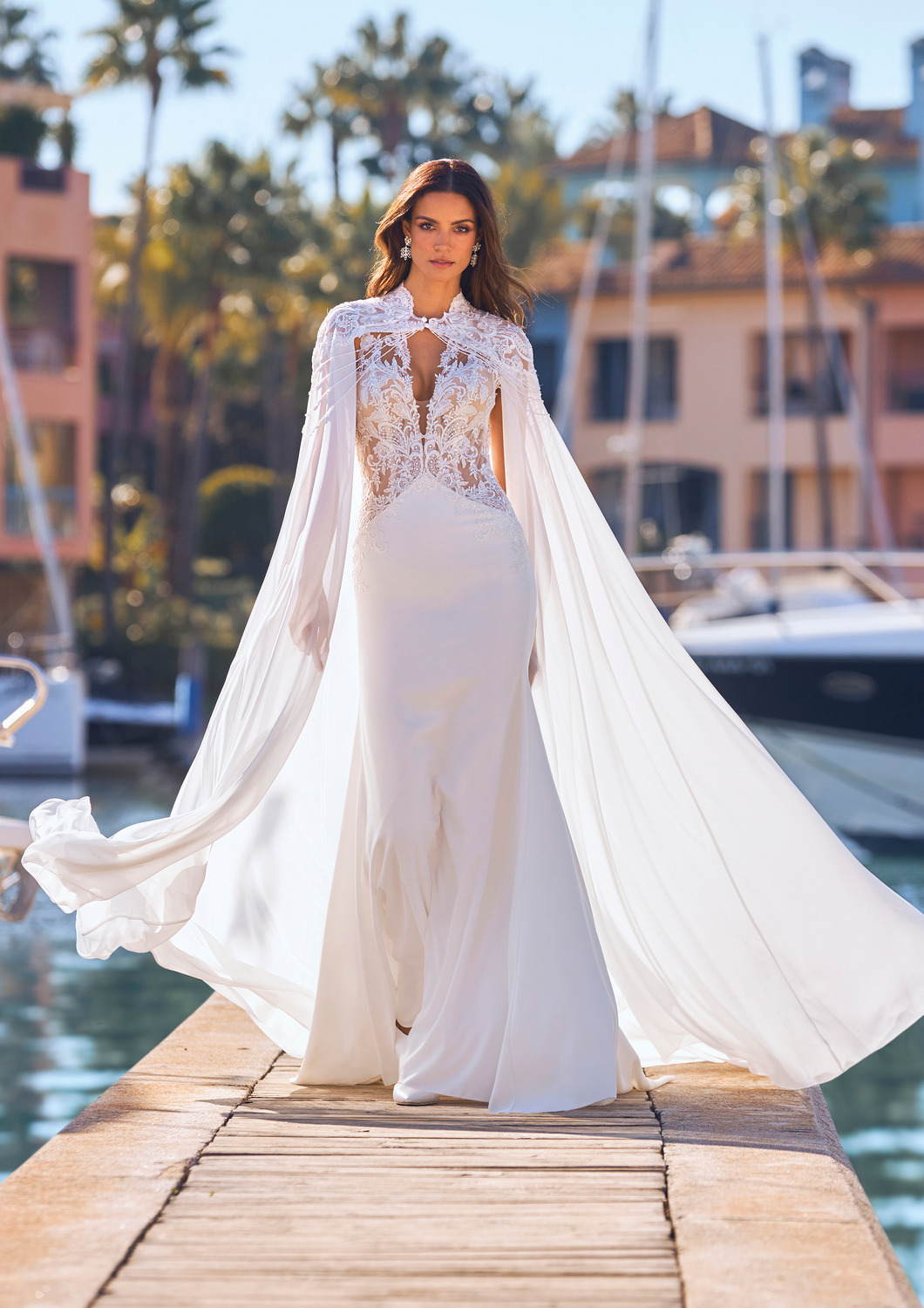 Wij zijn verliefd op deze chique en eigentijdse zeemeerminjurk van Pronovias! De zachte crêpe stof is soepelvallend en het kanten detail is prachtig. Het unieke lijfje met de onthullende kraaghalslijn, keyhole-rug en elegante taillelijn is zeer flatterend en accentueerd het silhouet. De baleinen en push-up cups geven je de ondersteuning die je nodig hebt. Deze jurk is perfect voor een moderne bruid die zich stijlvol en zelfverzekerd wil voelen op haar grote dag.