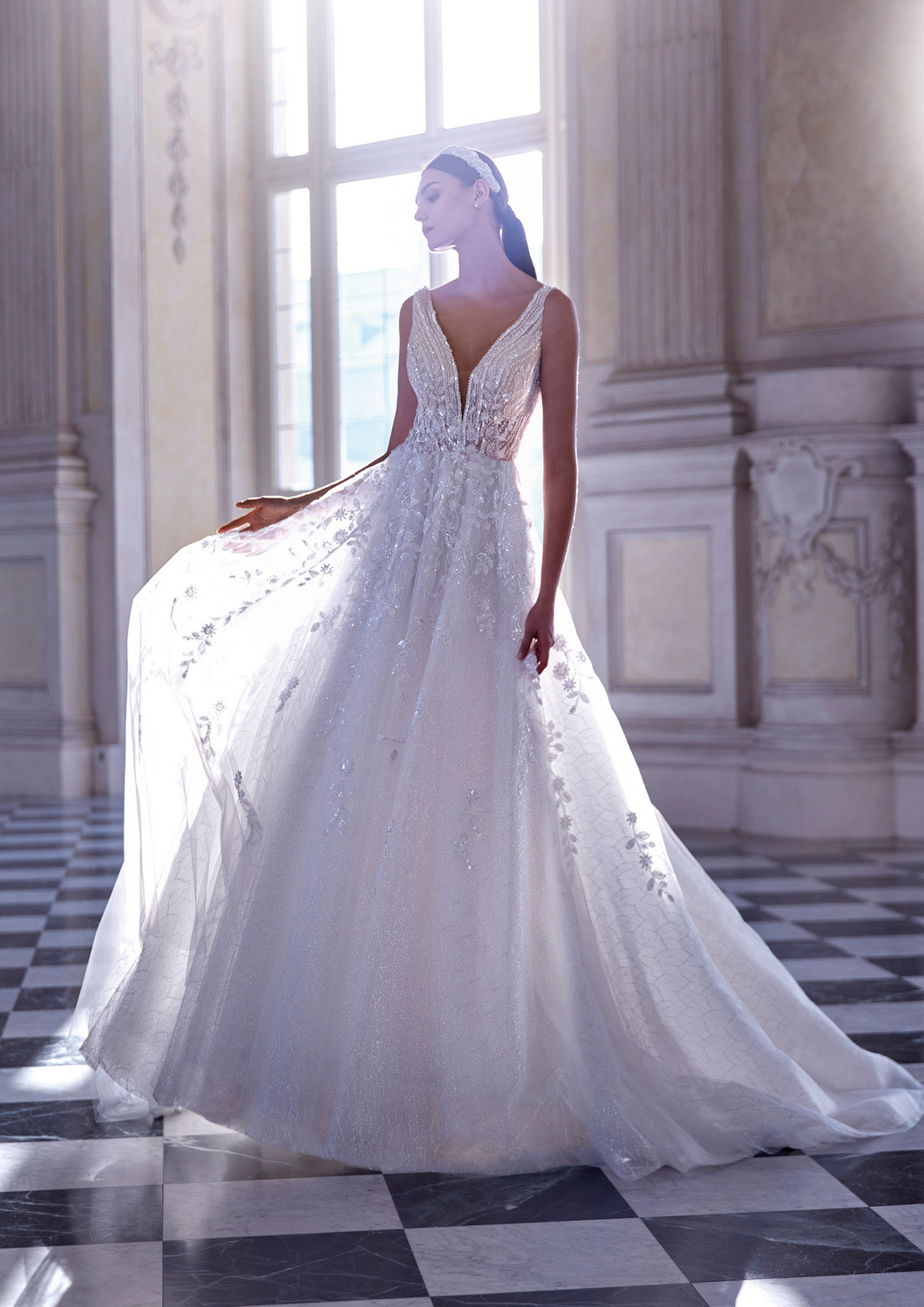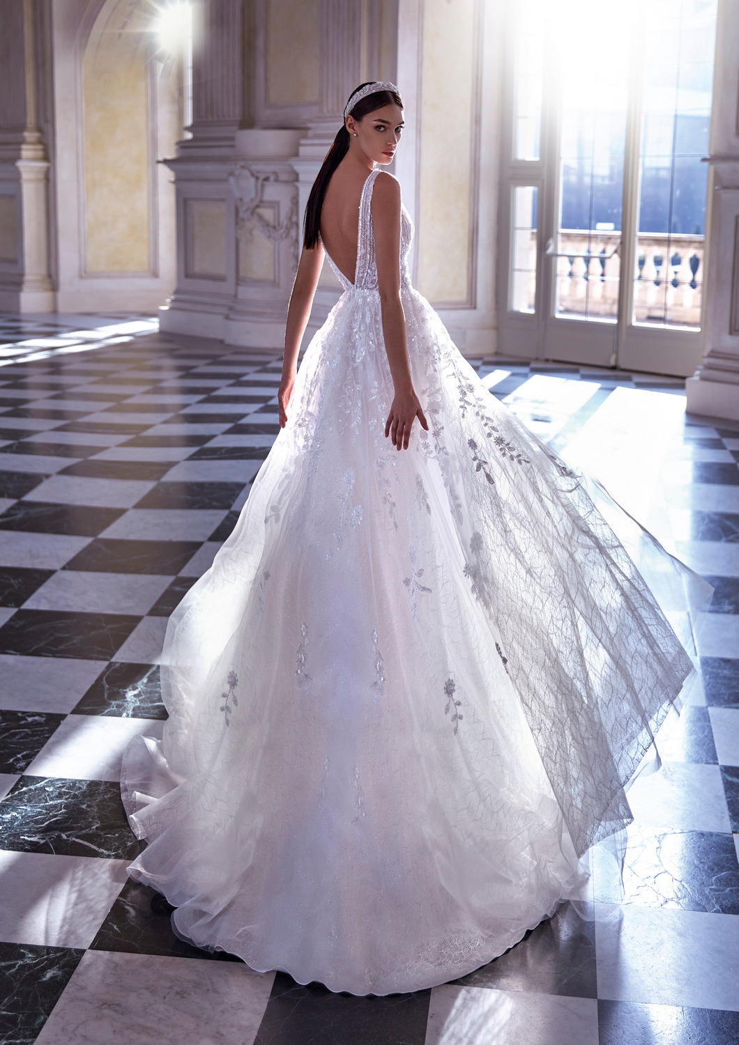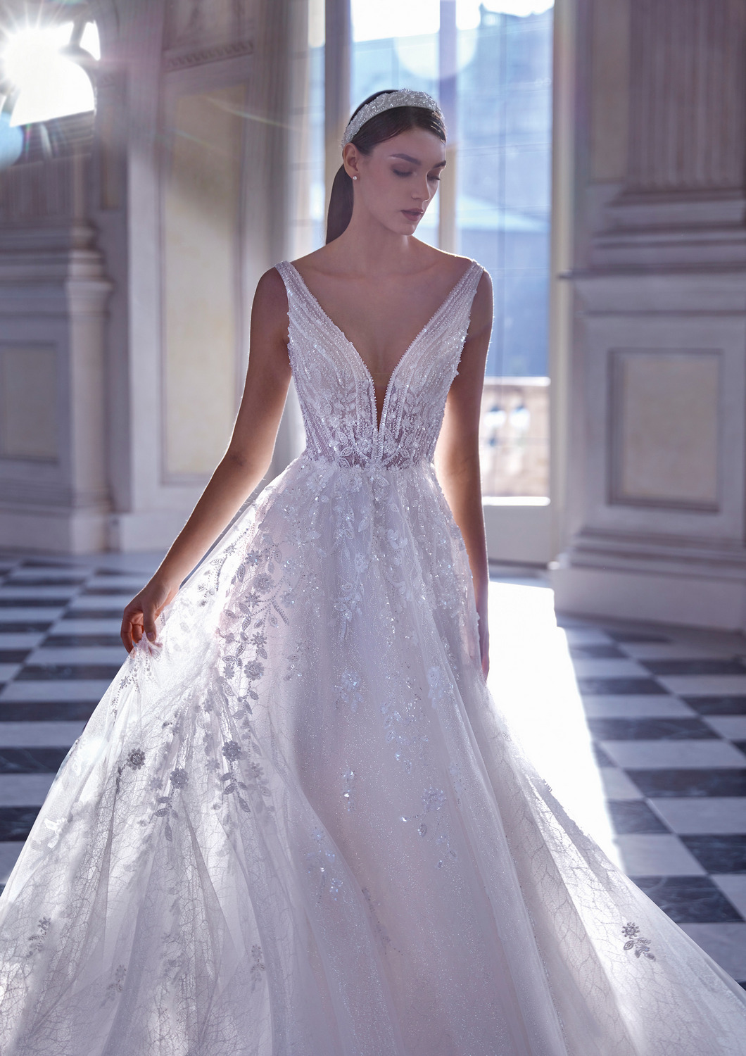Betover je aanstaande en alle gasten in deze schitterende en sprankelende trouwjurk van Pronovias! De glinsterende kralen en applicaties lopen in mooie lijnen over het lijfje die jouw figuur prachtig accentueren. De diepe v-hals en laag uitgesneden rug geven een sexy en speels effect. Je voelt je een prinses in deze luxe jurk op jouw bruiloft in een kasteel!
