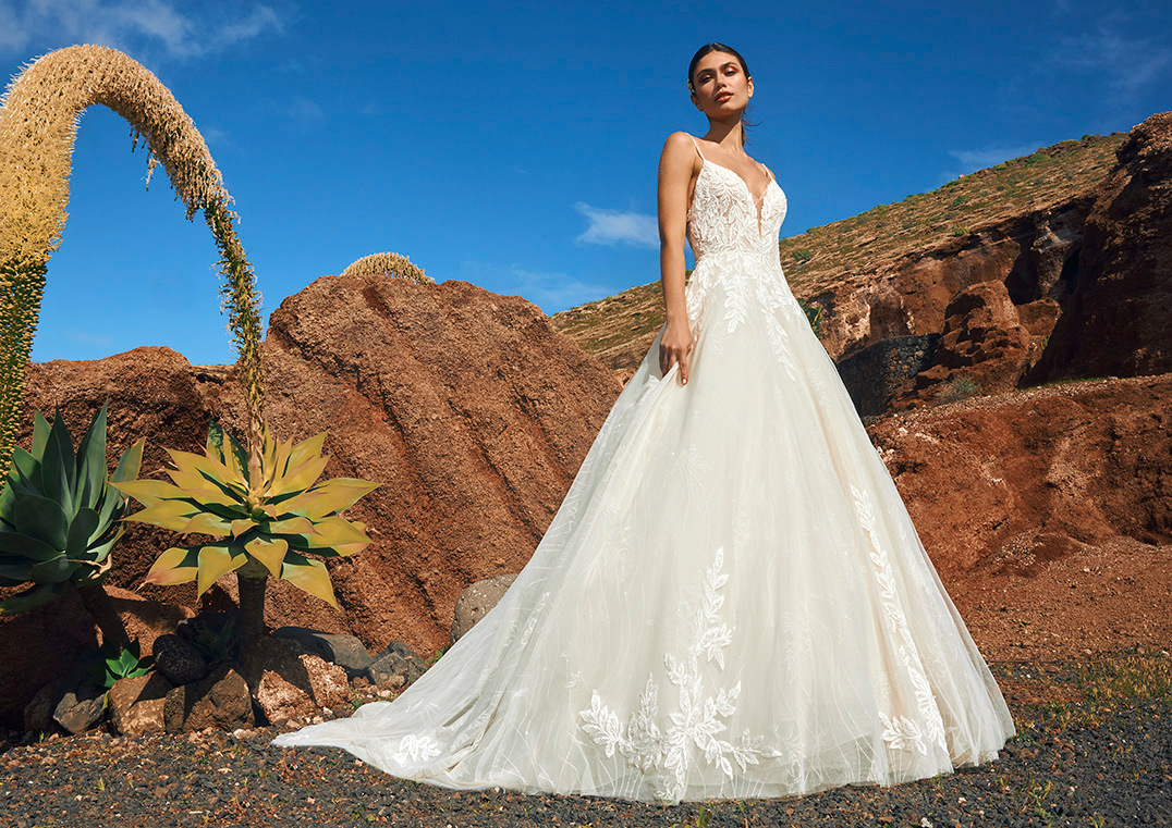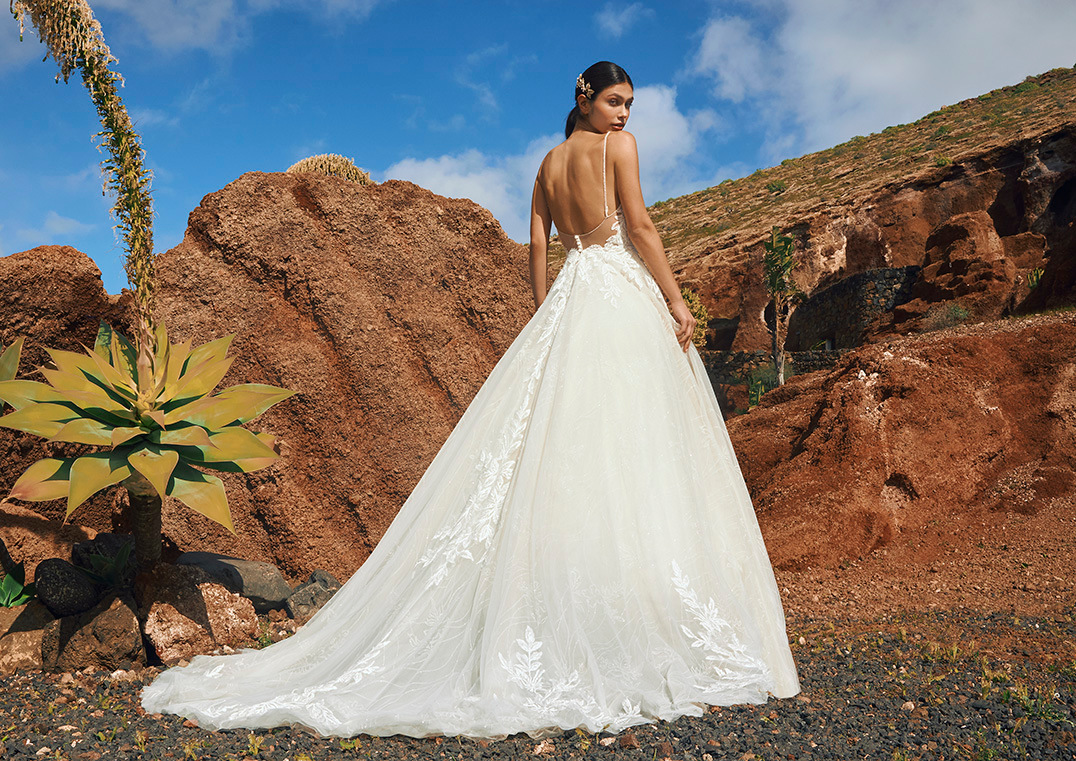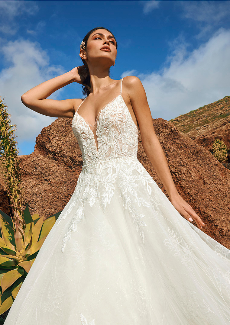 Een Ball gown trouwjurk met verfijnd kant, gemaakt van tule en subtiele glitters in de rok straal jij op de bruiloft. Unieke kanten applicaties versieren de jurk tot onderin de sleep. De diepe V-halslijn creëert lengte in je lichaam en siert jouw vrouwelijke vormen.