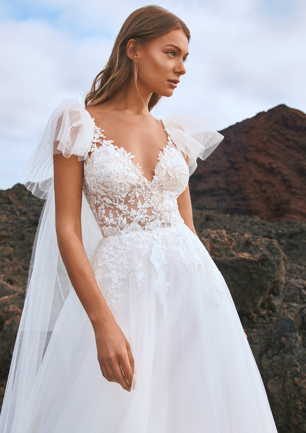Als je op zoek bent naar een romantische, dromerige trouwjurk, zoek dan niet verder dan de Tianzi van Pronovias. Deze prachtige jurk heeft een kanten lijfje met een V-hals en een lage rug. De A-lijn tule rok draagt bij aan de romantiek, terwijl de cape die vanaf de schouders loopt een vleugje uniciteit geeft. We hebben altijd een grote selectie Pronovias trouwjurken in onze winkel, dus maak vandaag nog een afspraak om ze te komen passen. We weten dat je niet teleurgesteld zult zijn!