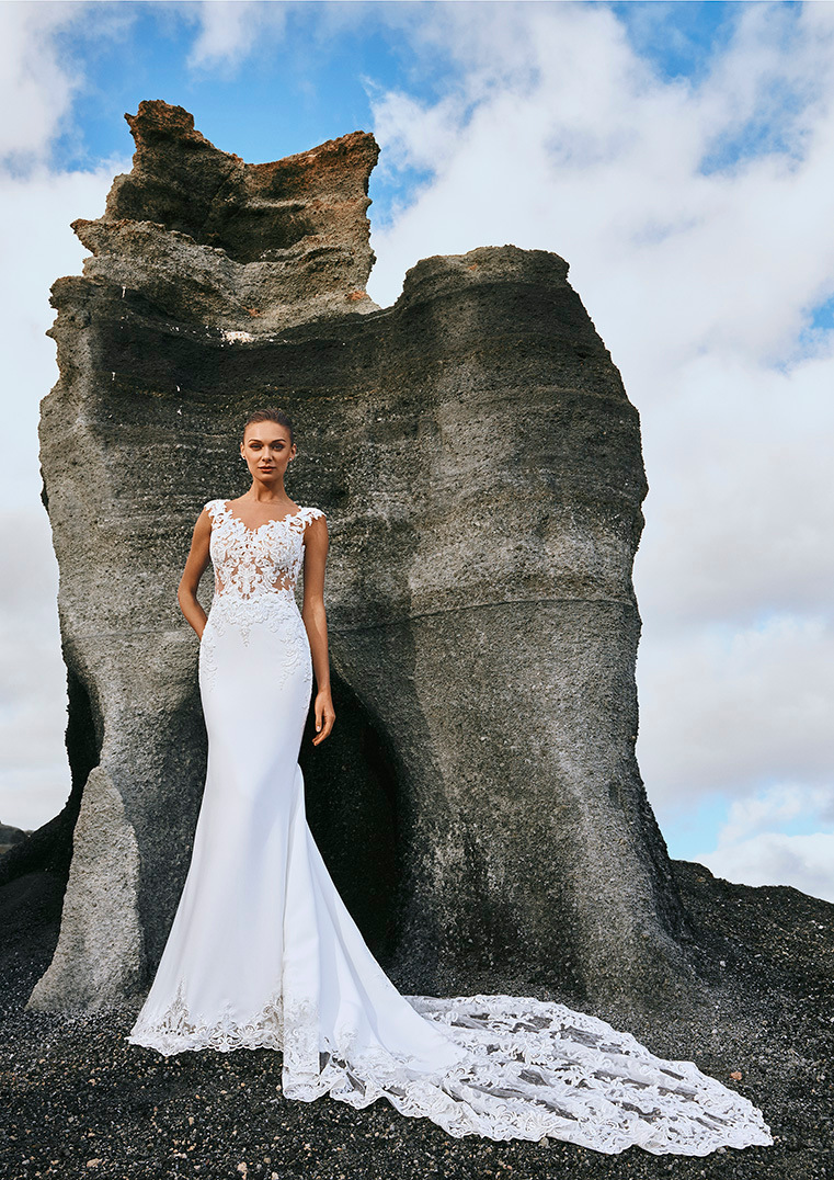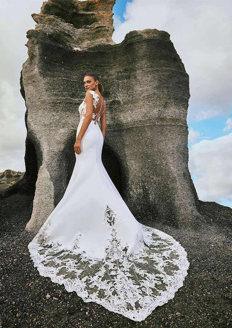 The Waitomo is all you ever wanted! Deze klassieke trouwjurk is gemaakt van crepe en heeft een illusion top, zowel aan de voorkant als aan de achterkant. Verder heeft deze mega mooie jurk ook nog een kanten rand en loopt dit door in de sleep aan de achterzijde. Dat maakt deze jurk uniek en klassiek tegelijk!
