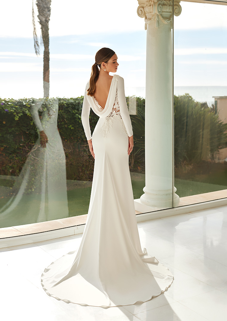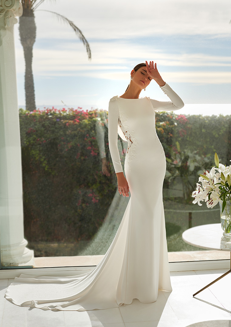 Deze prachtige moderne trouwjurk is de Aella van San Patrick. De jurk heeft een klassieke boothals, een adembenemende diepe rug en elegante lange mouwen. De sexy zijkanten met romantisch kanten illusie accentueren het vrouwelijke figuur. De soepele crêpe rok loopt uit in een mooie sleep. Deze trouwjurk is ook beschikbaar met een strakke V-hals.