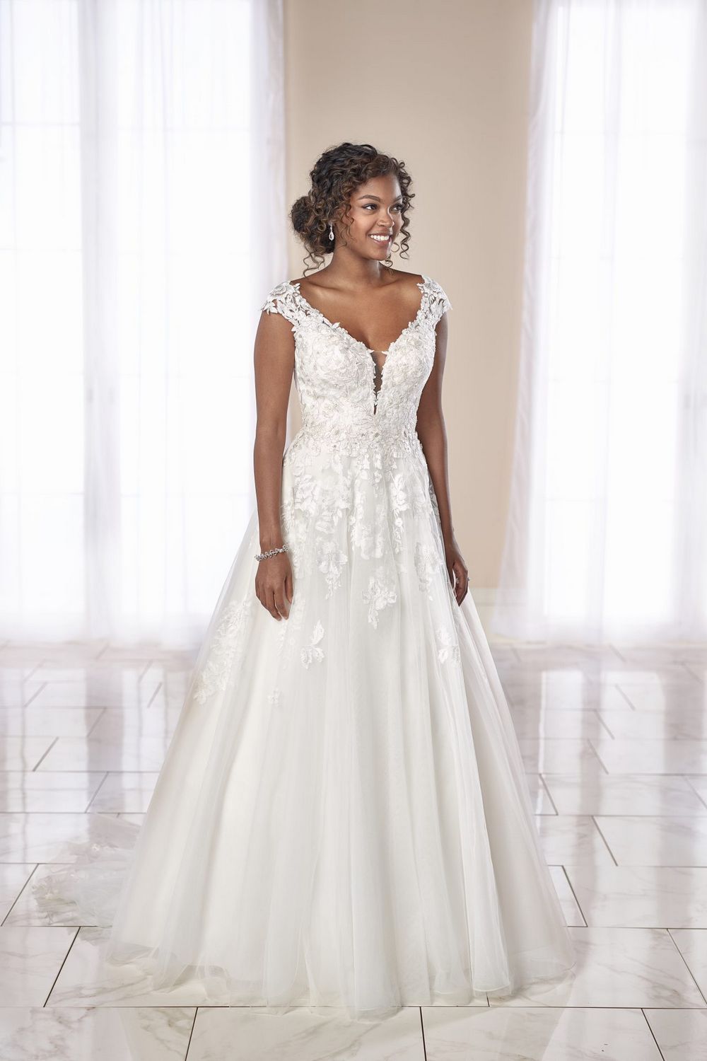 Romantische a-lijn trouwjurk van Stella York.Het lijfje is versierd met luxe kant en heeft een mooie diepe v-hals en diepe v-rug. Deze trouwjurk heeft kleine kapmouwjes die net over je schouder vallen. De rug is afgewerkt met kleine pic-pac knoopjes.