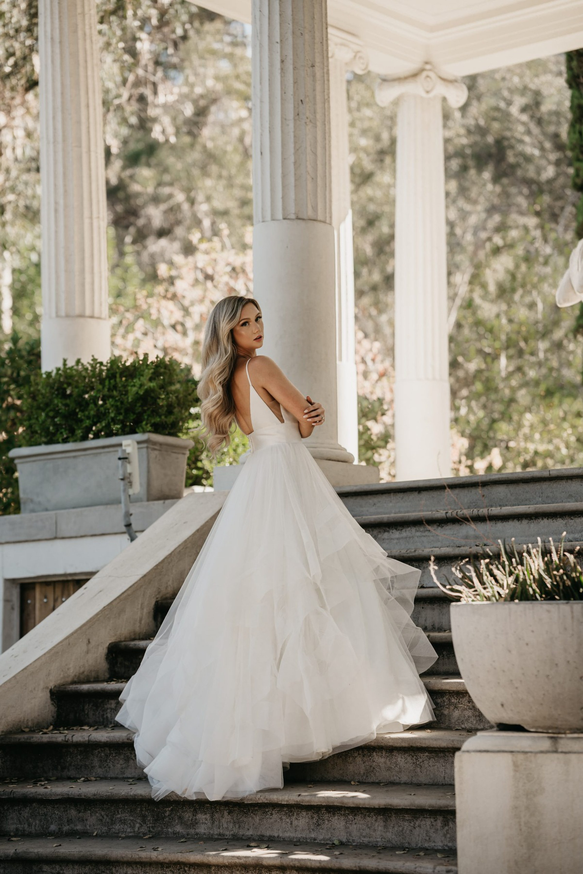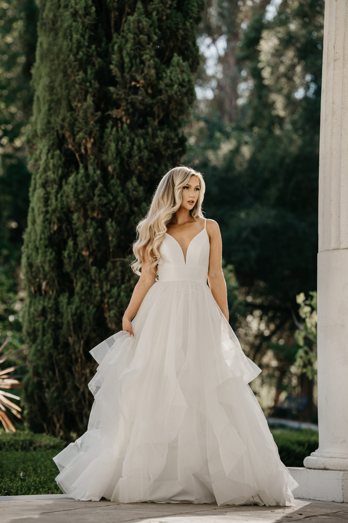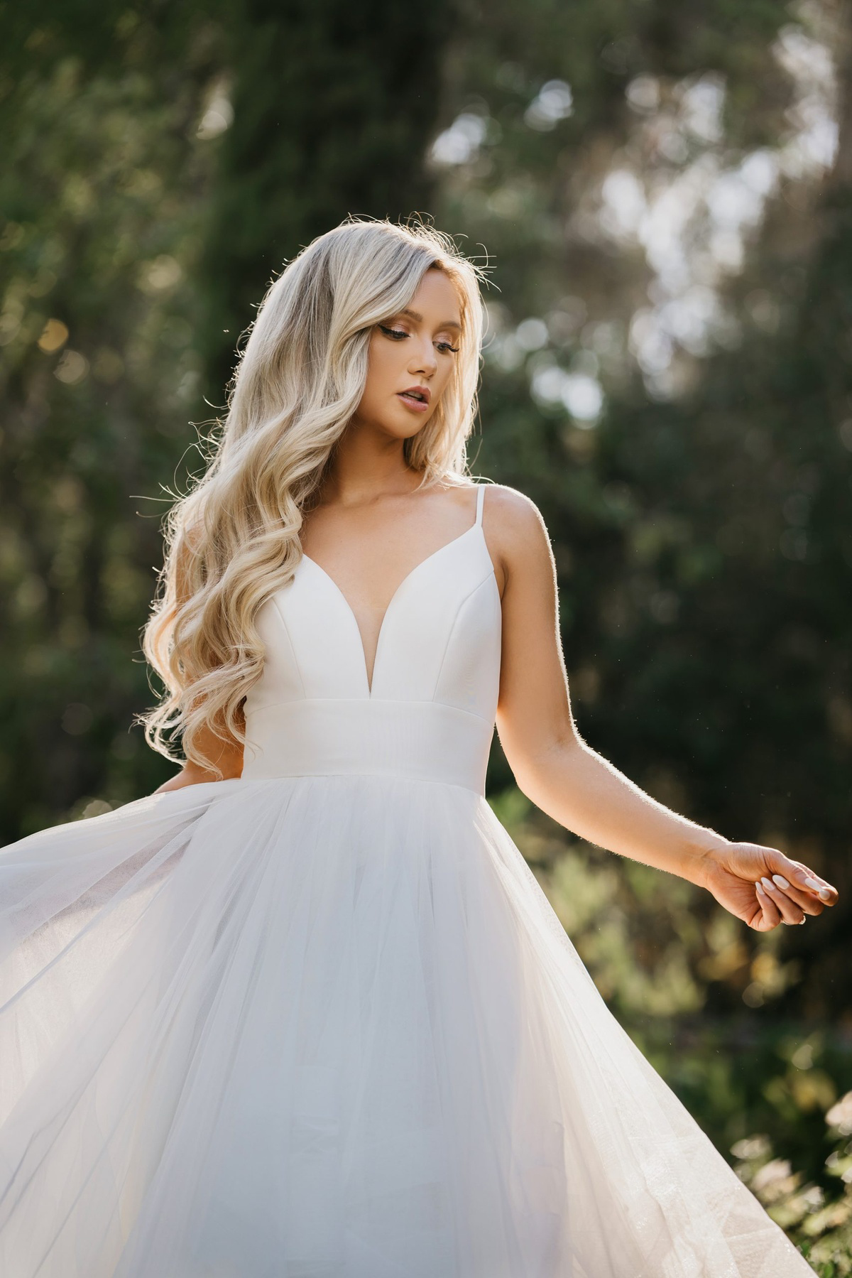 Deze trouwjurk van Stella York is een aparte combinatie van een minimalistisch lijfje en een speelse, flirterige rok. De brede taillelijn zorgt voor een extra slank effect in de taille. Het is een echte ball gown voor de bruid die gaat voor een prinsessenlook. Deze trouwjurk is ook geschikt voor de bruid met een maatje meer.
