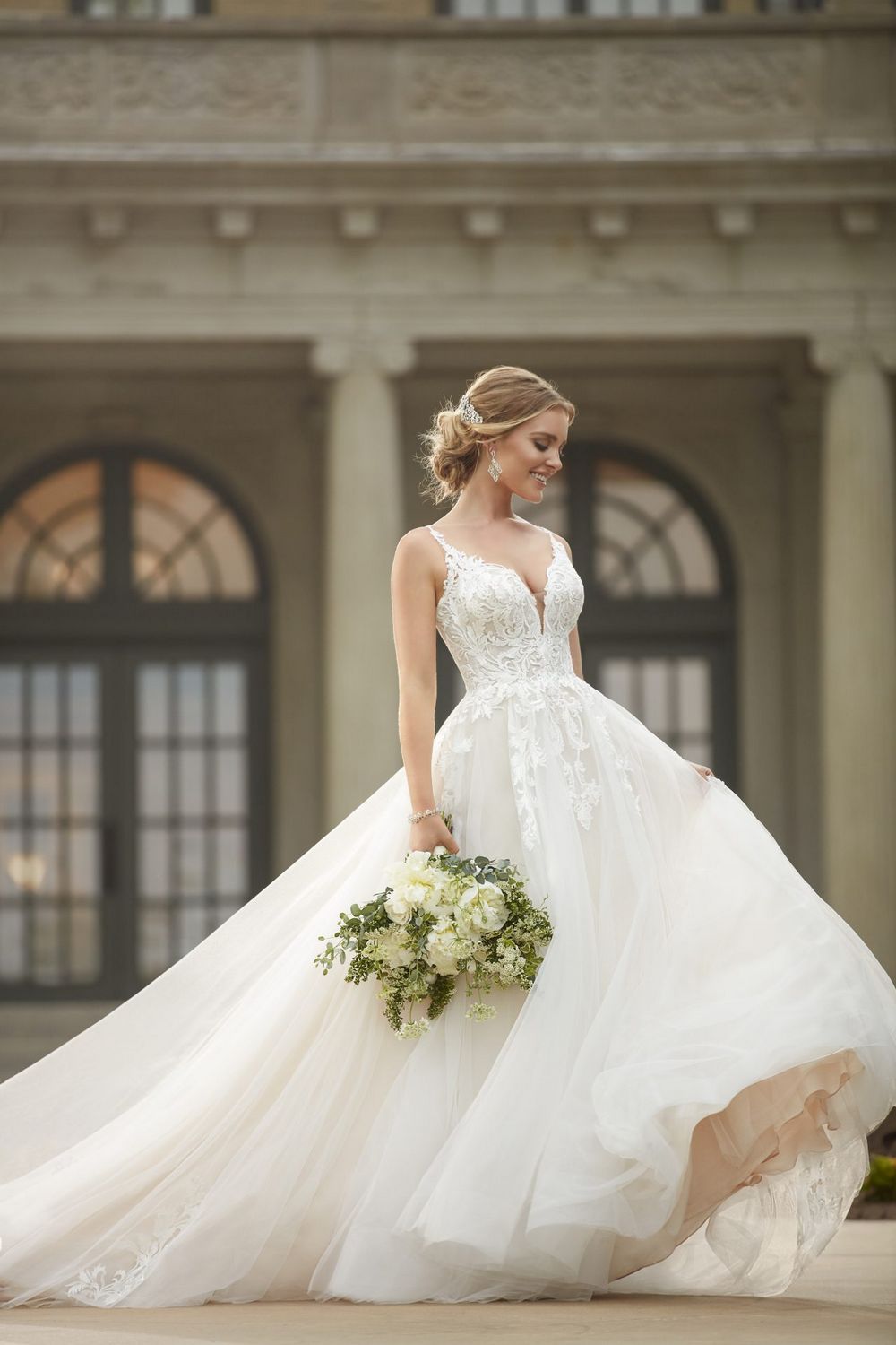 A-lijn trouwjurk van Stella York. Deze romantische én verleidelijke japon is gemaakt van glittertule en kant. Het lijfje heeft een diep decolleté en smalle schouderbandjes.