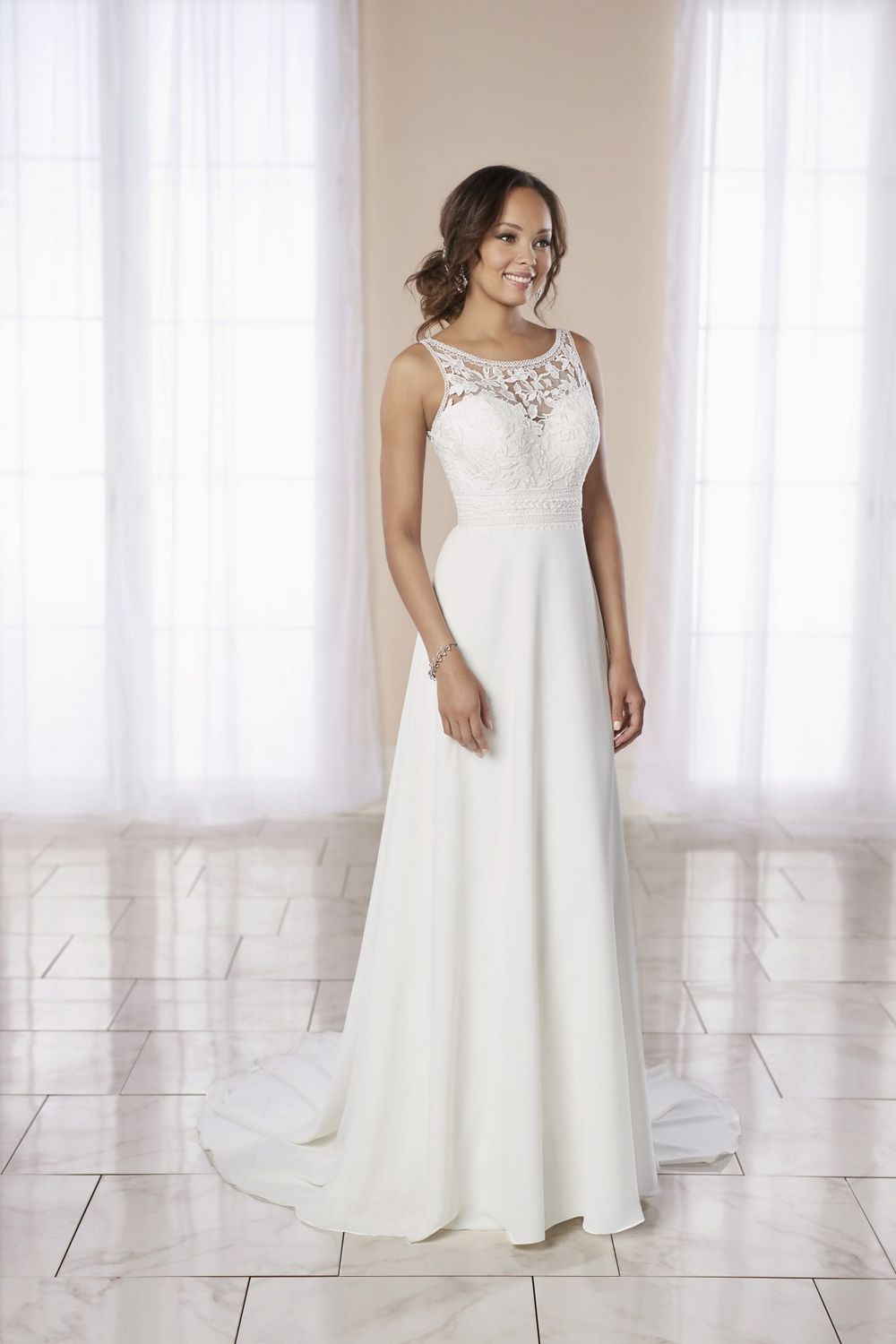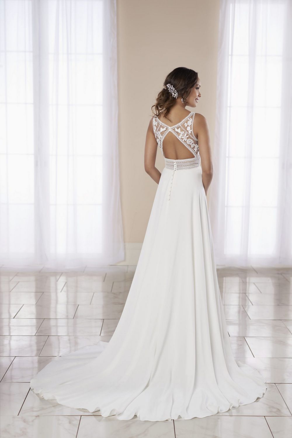 Een op boho geinspireerde trouwjurk van zacht vallende crêpe. Classy aan de voorzijde met een verrassende sexy keyhole in de rug.
