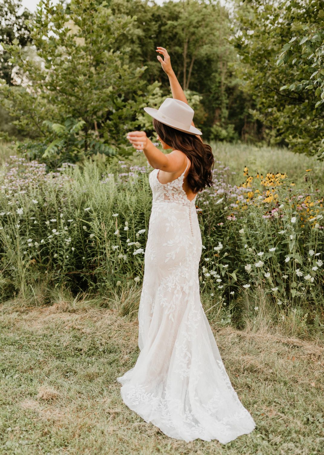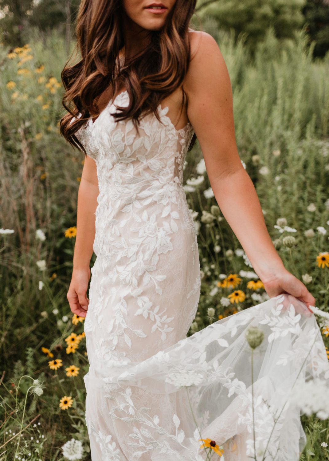Een bijzonder fit & flare model met unieke kanten details. Dunne bandjes met een V-hals dat een romantische uitstraling geeft. Een mooie sleep voor een echt boho gevoel.