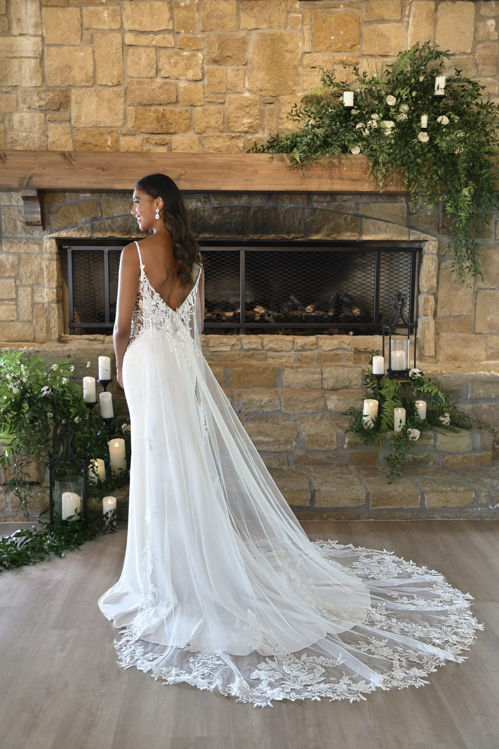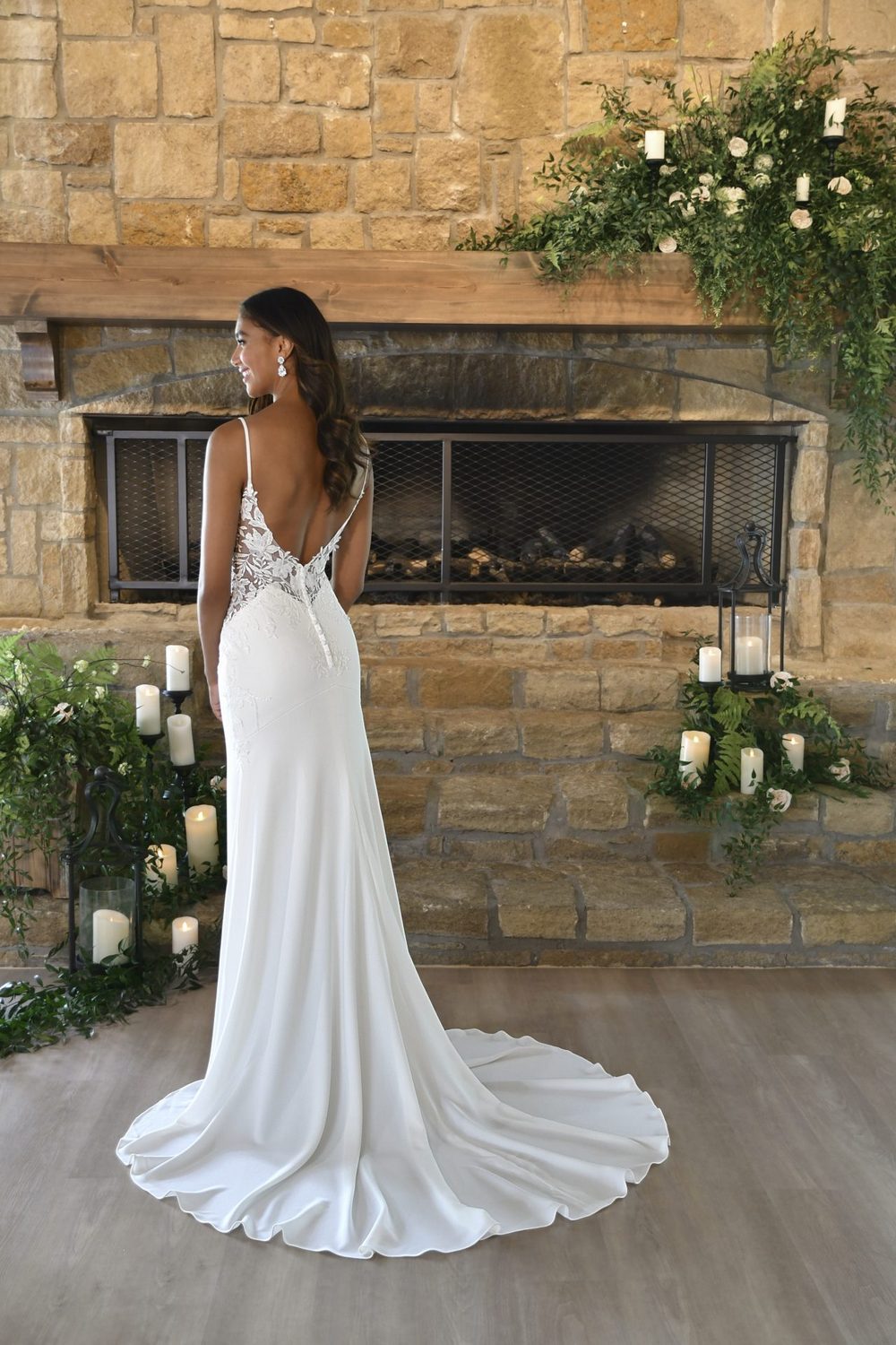 Binnen de collectie van Designer Stella York vind je deze prachtige trouwjurk! Perfect voor de moderne bruid die wil stralen op haar grote dag. Het lijfje van deze jurk is versierd met sprankelende kralen details en gevarieerd gebloemd kant. Als je op zoek bent naar een romantische trouwjurk met een boho-flair, dan is deze trouwjurk de perfecte keuze! Deze jurk met minimalistische eigenschappen heeft een modern fit & flare silhouet. De schouderbandjes leiden tot een diepe halslijn, terwijl de kanten accenten textuur en dimensie toevoegen. De zijuitsnijdingen pronken met een uniek kantpatroon en de afneembare sleep zorgt voor een mooie finishing touch. De grote bloemenapplicaties op de sleep geven deze jurk een etherisch, dromerig gevoel. Stella York zorgt ervoor dat je je op je trouwdag als een bruid voelt!