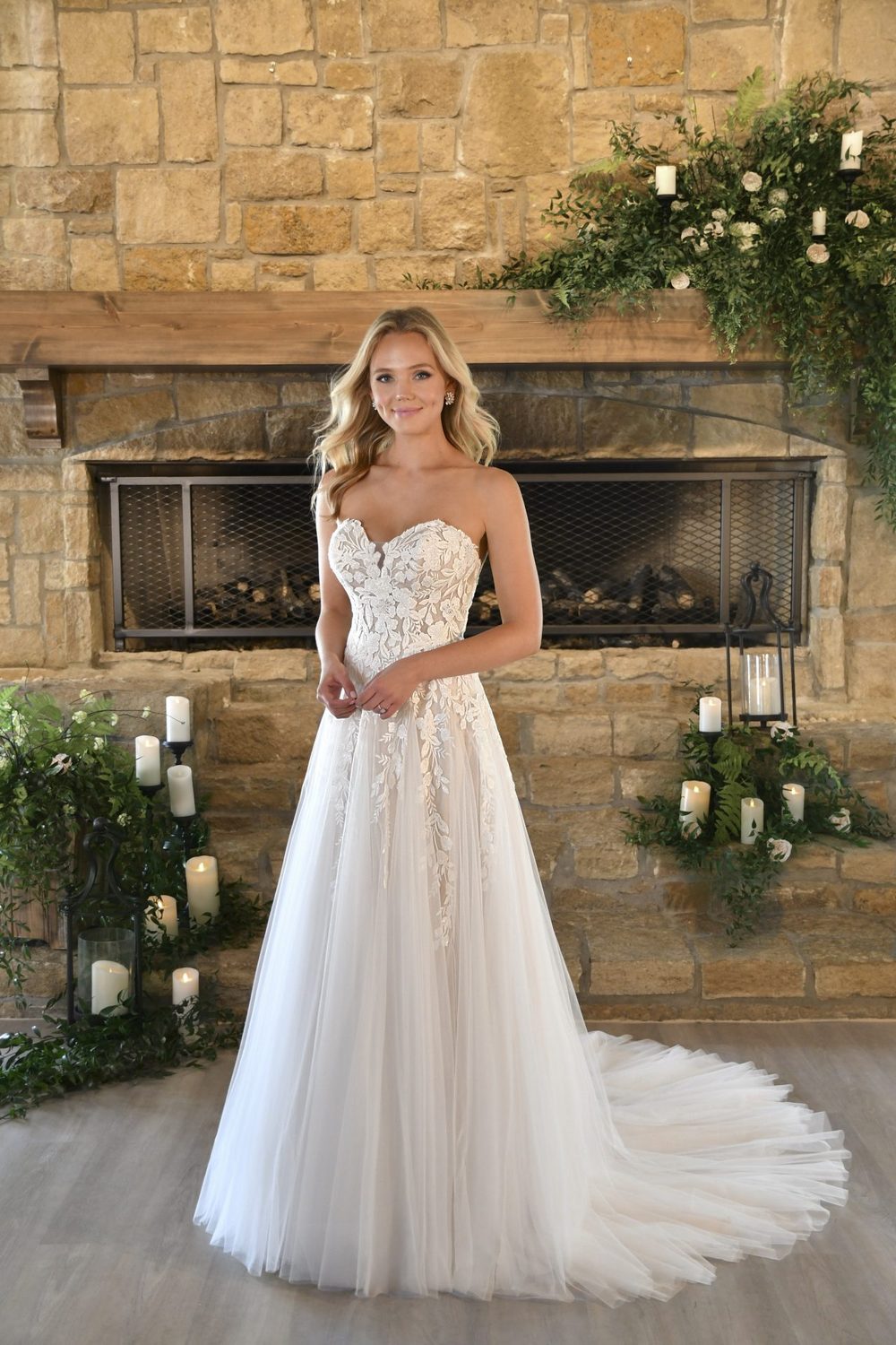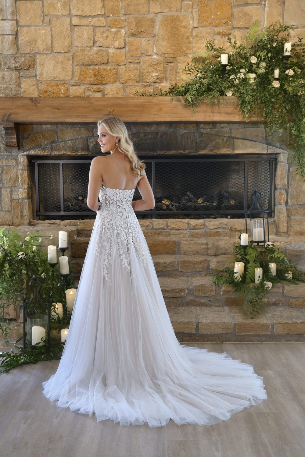 Deze trouwjurk van Designer Stella York is een op ballerina's geïnspireerde jurk met volume ontworpen voor de moderne romanticus. Van de sweetheart halslijn tot gevarieerde gebloemde kanten details, deze jurk brengt de charme die je zoekt. Het strapless lijfje is versierd met grootschalige geborduurde bloemen die via de bovenkant van de rok naar beneden lopen. In de taille lopen laagjes delicate sprankelende tule uit tot een luchtige rok die moeiteloos meebeweegt met elke beweging. Aan de achterkant geven met stof beklede knopen een tijdloze bruidslook aan deze jurk, met een open rug voor een subtiel sexy tintje. Dans de hele nacht in gracieuze stijl met deze moderne bruidsjurk op jouw strandbruiloft.