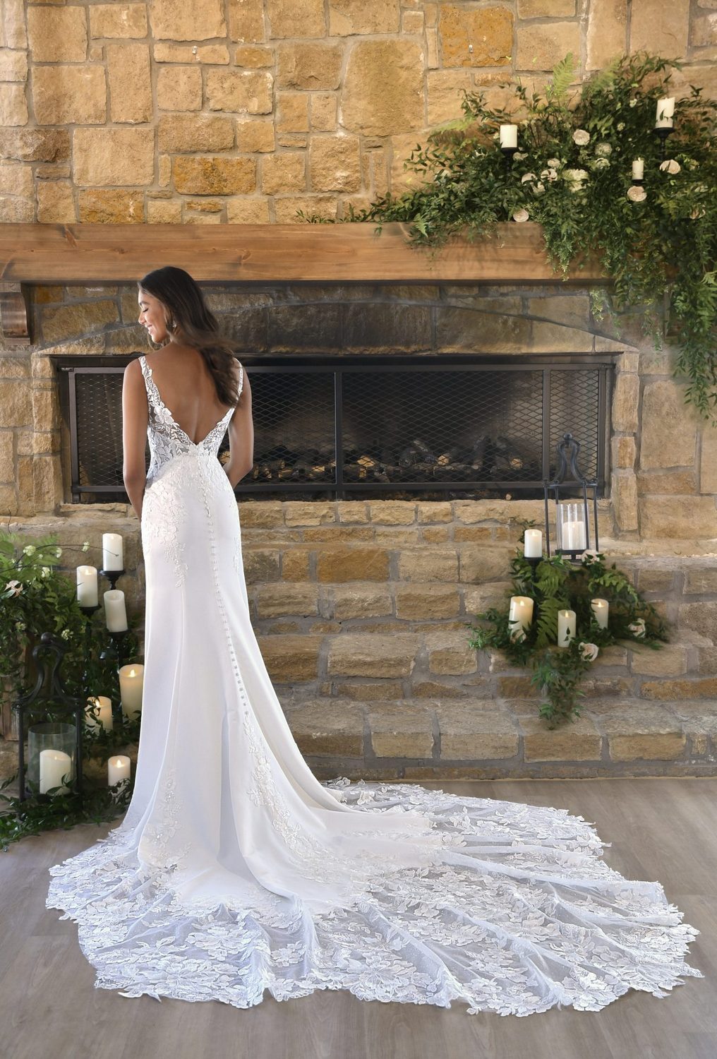 Laat je de adem benemen door de natuurlijke schoonheid van deze trouwjurk van Designer Stella York. Deze prachtige fit & flare soepel vallende jurk is versierd met blad-geïnspireerde kantmotieven, die ook te vinden zijn op de bandjes en het lijfje. Doorschijnende elementen voegen een sexy touch toe, terwijl de diepe V-halslijn ondersteuning biedt en het lichaam vormgeeft. De taille wordt geaccentueerd met een prachtig mat satijn dat het lichaam omhelst en het chique silhouet afmaakt. De sleep is prachtig, met bloemmotieven geaccentueerd met pure tule stof. Deze jurk is perfect om een grootse entree te maken op je trouwdag. Zeer geschikt voor jouw bruiloft in een mooie tuin, bos, kas of op het strand.