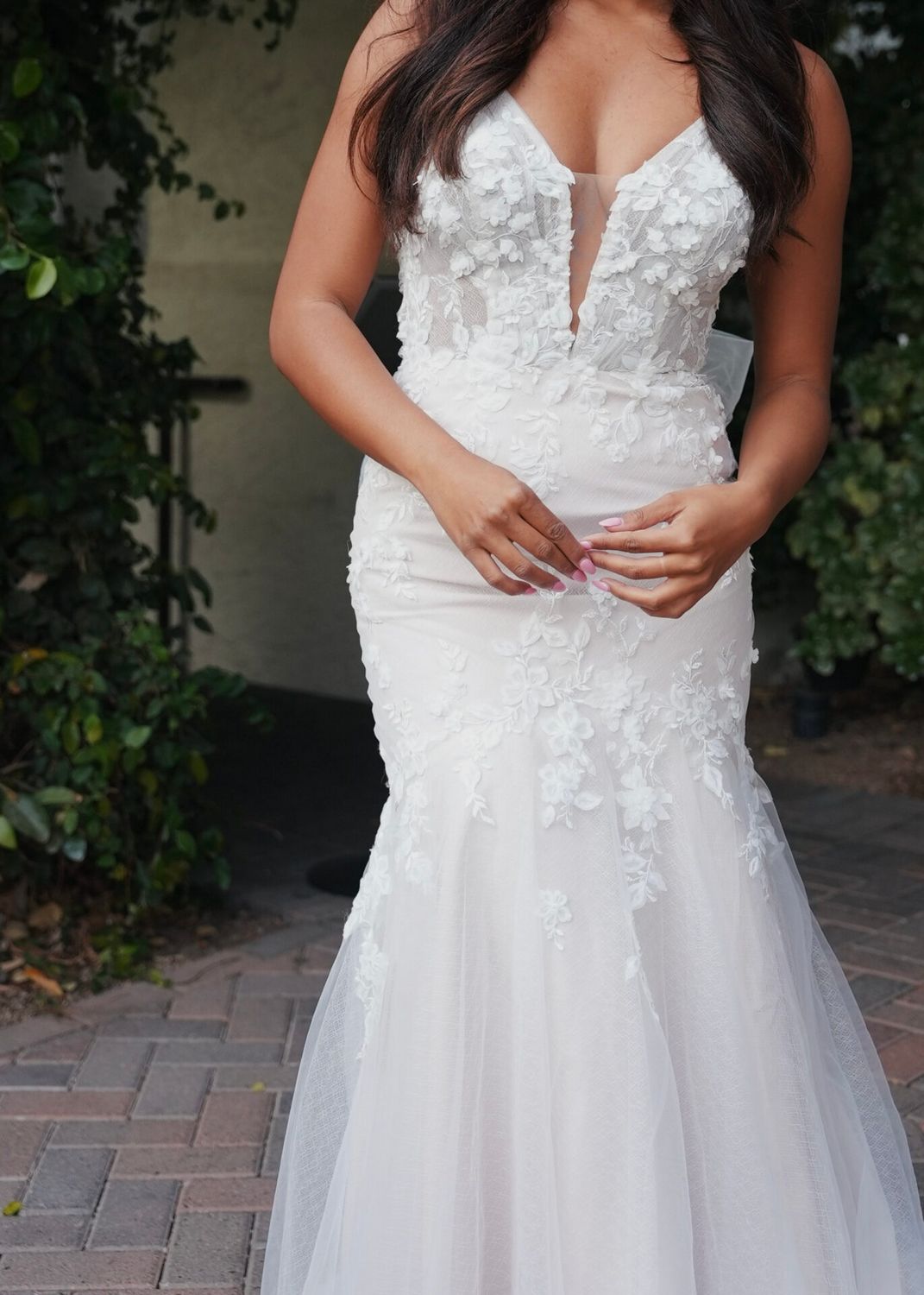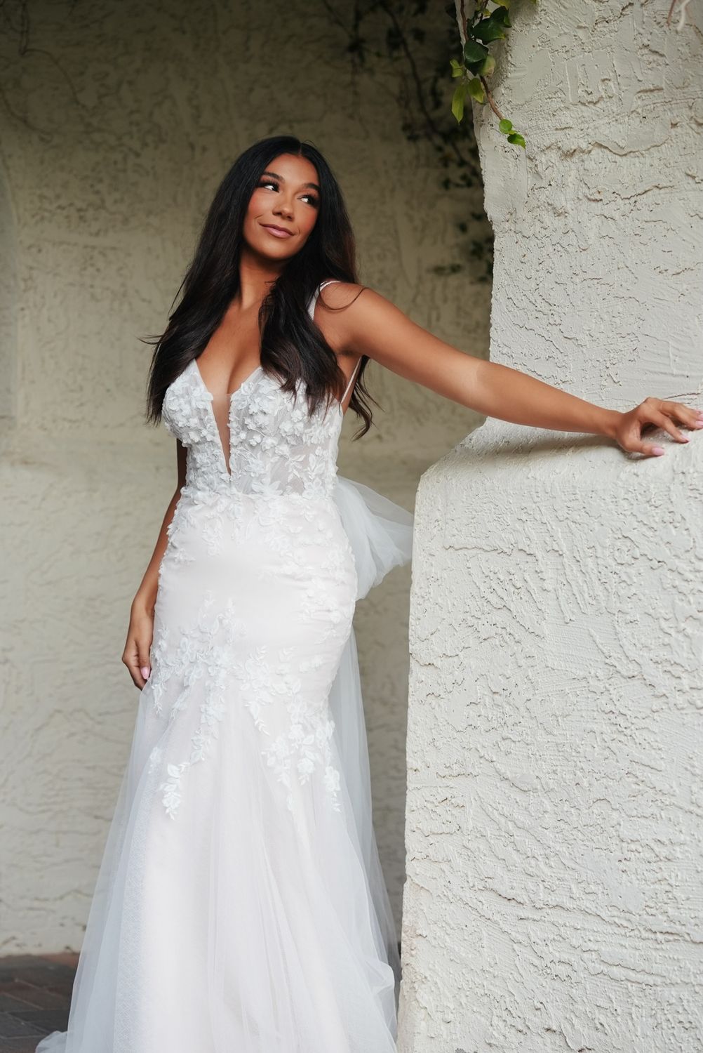 De fijne driedimensionale bloemen en flirterige, trendy accenten maken deze trouwjurk tot een goede keuze voor de moderne bruid. De jurk heeft een diep uitgesneden halslijn met illusie tule aan de voorkant. De rug is diep uitgesneden met een waanzinnige strik! Je rondingen komen prachtig uit in deze jurk doordat de rok na de heupen uitloopt in een fishtail.