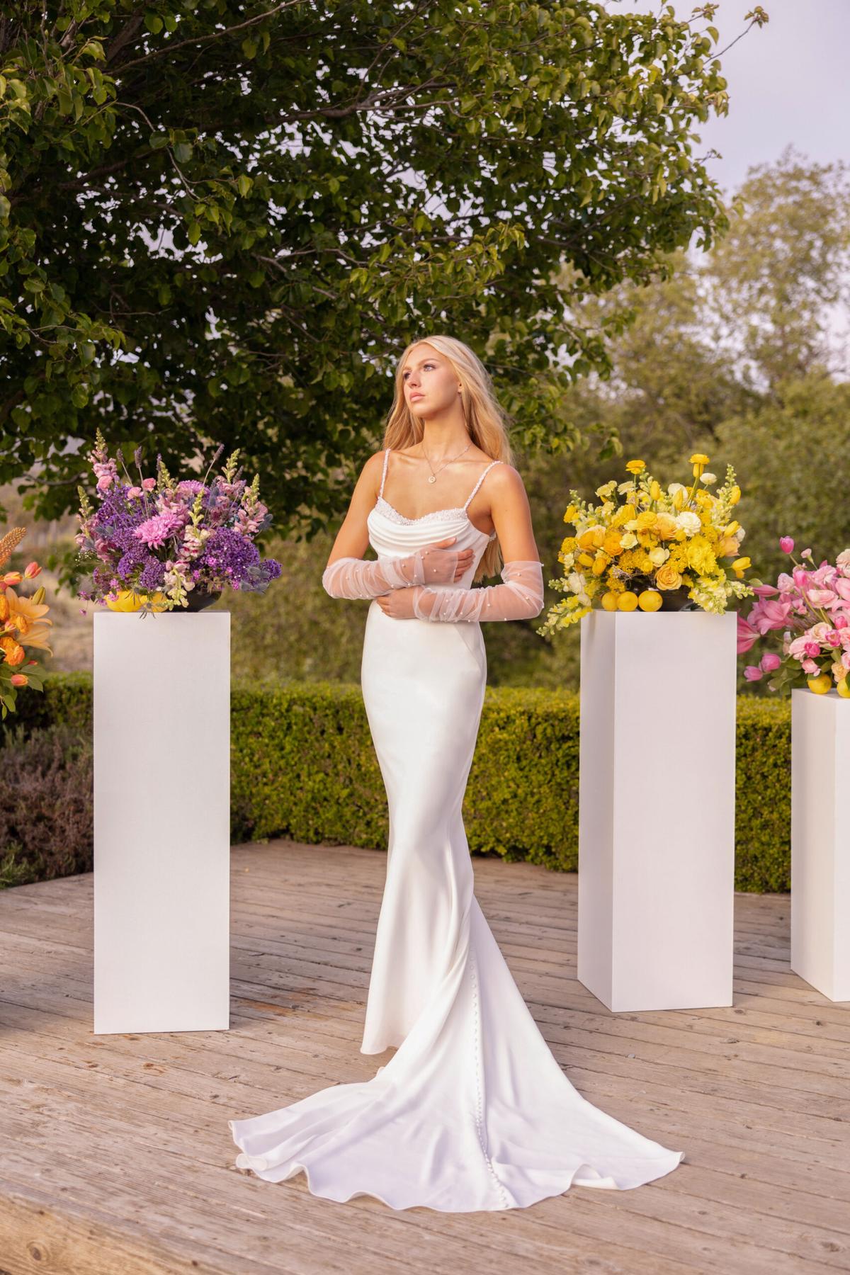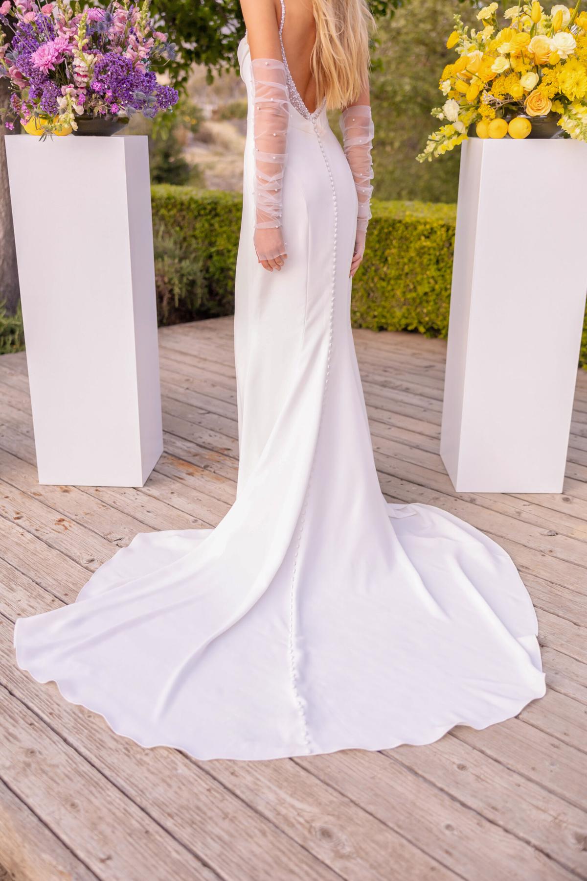 Elegant en aangesloten, deze minimalistische trouwjurk is het voorbeeld van een moderne trouwjurk. Voor de bruid die houdt van less is more, is deze sexy trouwjurk super geschikt. Door de soepelvallende en zachte zijde crêpe valt deze trouwjurk als een tweede huid om je lichaam. De dunne, met kralen bezette spaghettibandjes geven de jurk een elegante look. De lage rug is een echte eyecatcher, geaccentueerd met parels en steentjes bezette mesh. Deze designer trouwjurk is gemaakt voor de eigentijdse bruid met een affiniteit voor high fashion.
