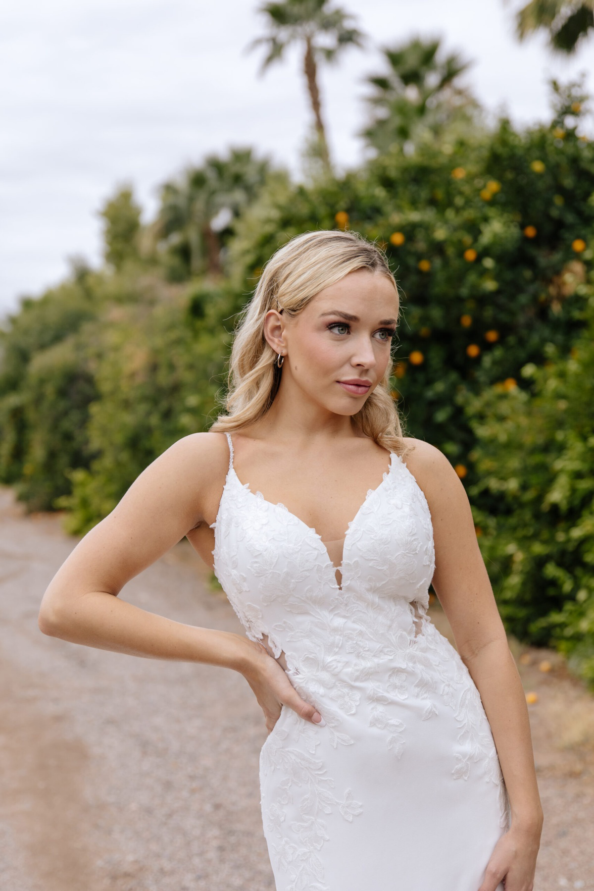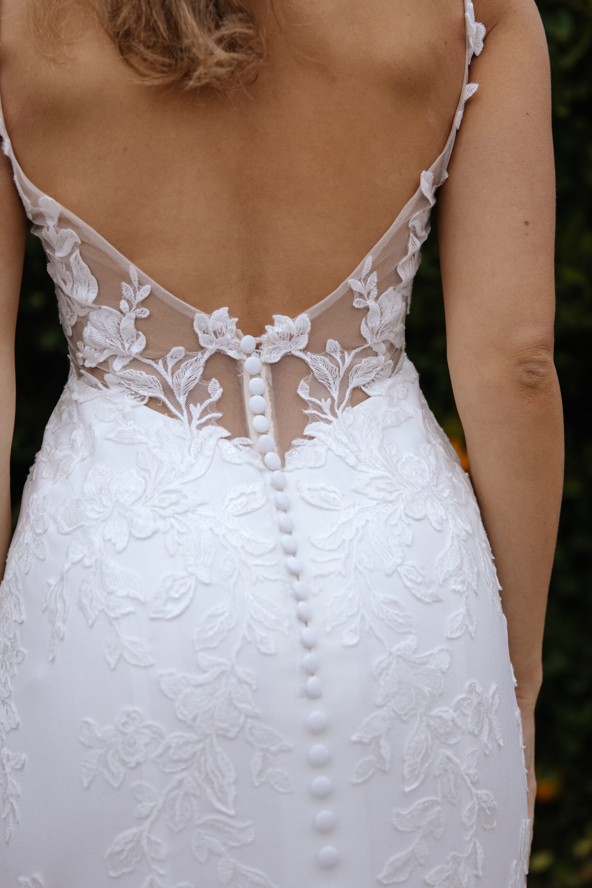 In een adembenemende mix van sexy modern design en tijdloze romantiek, is Stijl 7855 een oogverblindende kanten en crêpe trouwjurk met prachtige handgemaakte details overal. Met kralen bezette spaghettibandjes leiden naar een zachte V-hals, waardoor het oog wordt geleid naar een prachtige aangesloten lijfje met transparante kanten zijkanten die het natuurlijke zandloperfiguur accentueren. Romantiek bloeit met handgemaakte bloemige kanten applicaties die langs de aangesloten rok naar beneden vallen om het silhouet in elegantie te omlijsten. Met een opvallend laag uitgesneden kanten detail aan de achterkant en stof beklede knopen langs de achterkant tot aan de zoom van de sleep, verrukt deze glinsterende met kralen bezette spaghettibandjes de trouwjurk vanuit elke hoek.