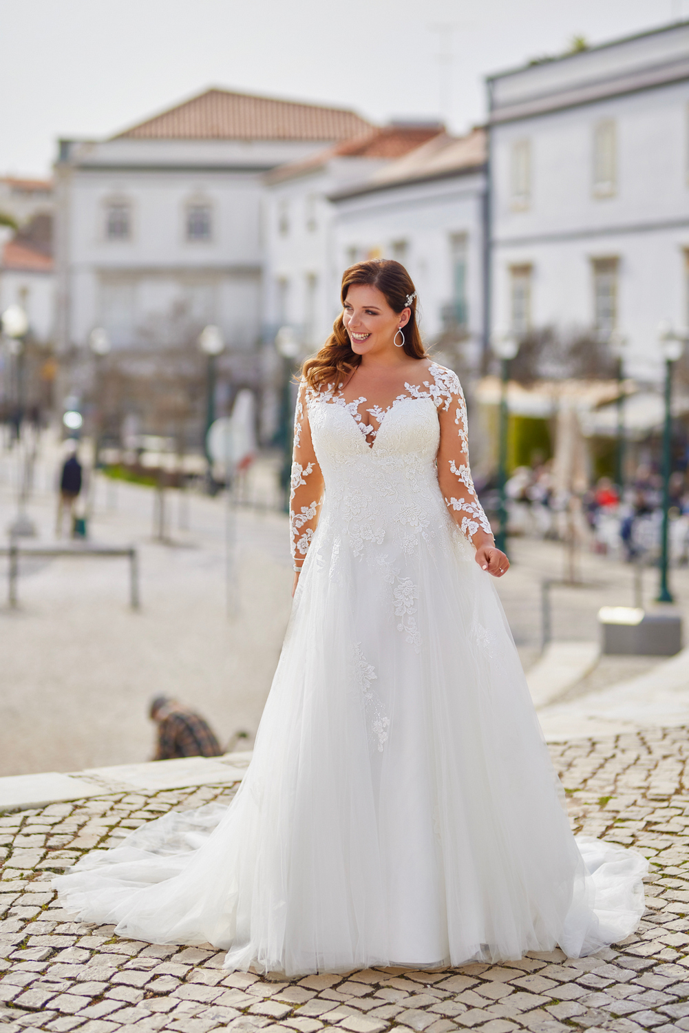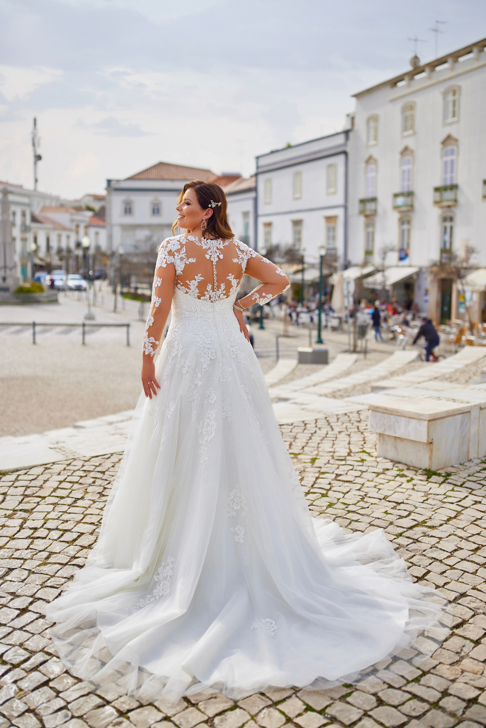 Voor de bruid die op zoek is naar elegantie en romantiek, is deze trouwjurk fantastisch. De kanten applicaties zijn delicaat geplaatste op de illusie lange mouwen en rondom de v-hals. Ook zijn deze prachtig symmetrisch geplaatst op de illusie rug. De tule rok is flowy en sprookjesachtig. Laat je dromen uitkomen met deze trouwjurk op jouw bruiloft in een kasteel, tuin, bos of kas.