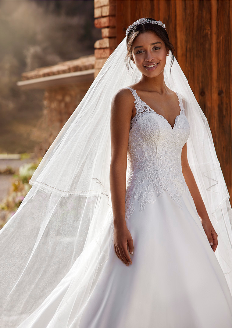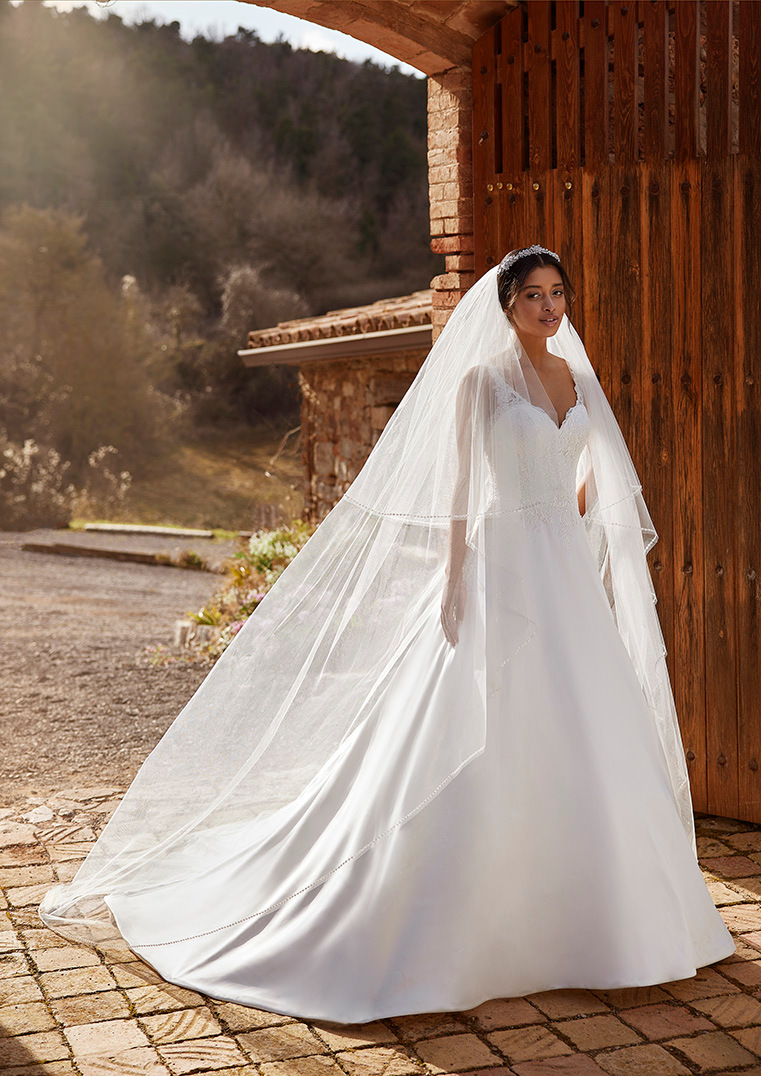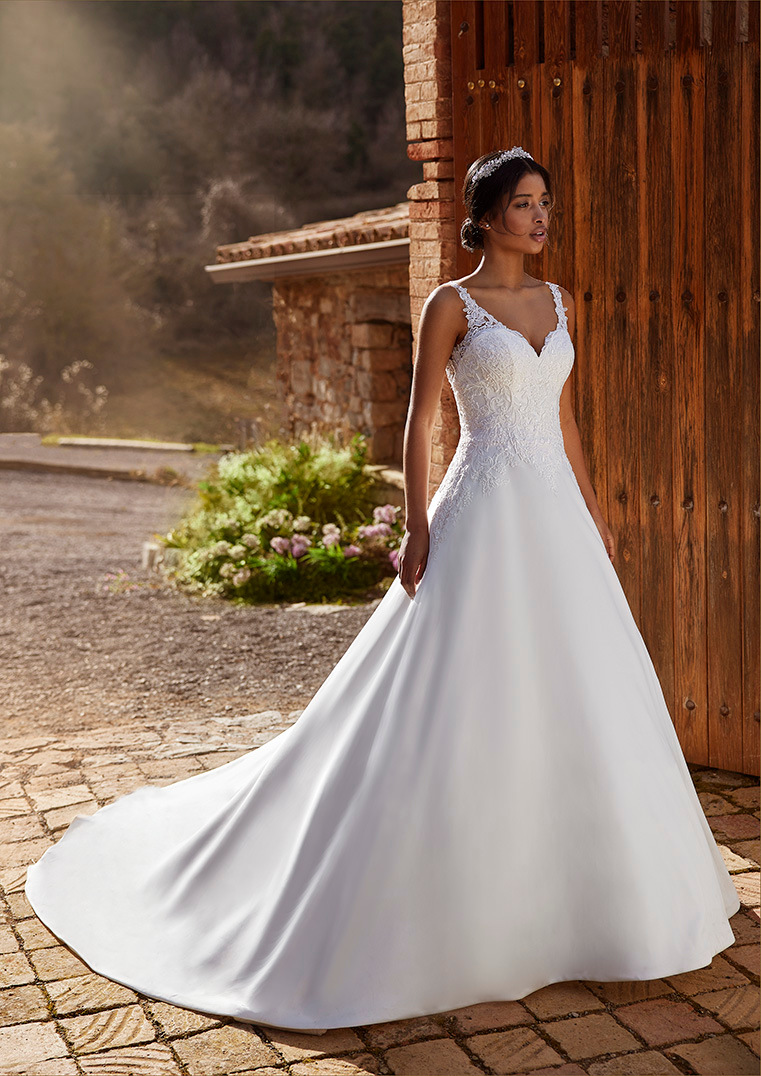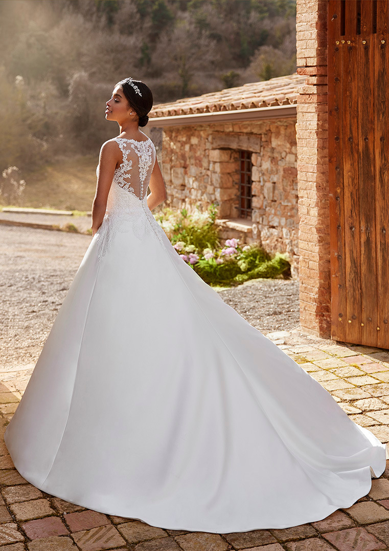 Een klassieke en chique jurk van de fantastische stof Mikado. Een A-lijn silhouet dat je taille super flatteert. Een sweetheart halslijn en illusion achterkant zorgen voor een sexy uitstraling in combinatie met knoopjes die doorlopen in de sleep.