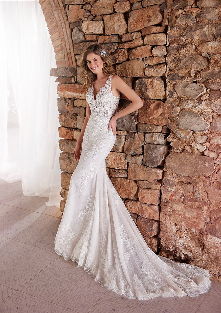 Deze mermaid dress is gemaakt van Heirloom-kant. Dit kant is uniek en vol stijl te dragen. De open rug is sexy en flatteert je lichaam. In combinatie met een V-halslijn en een illusion top, is het perfect voor romantische, klassieke, boho en vintage thema's op de bruiloft.