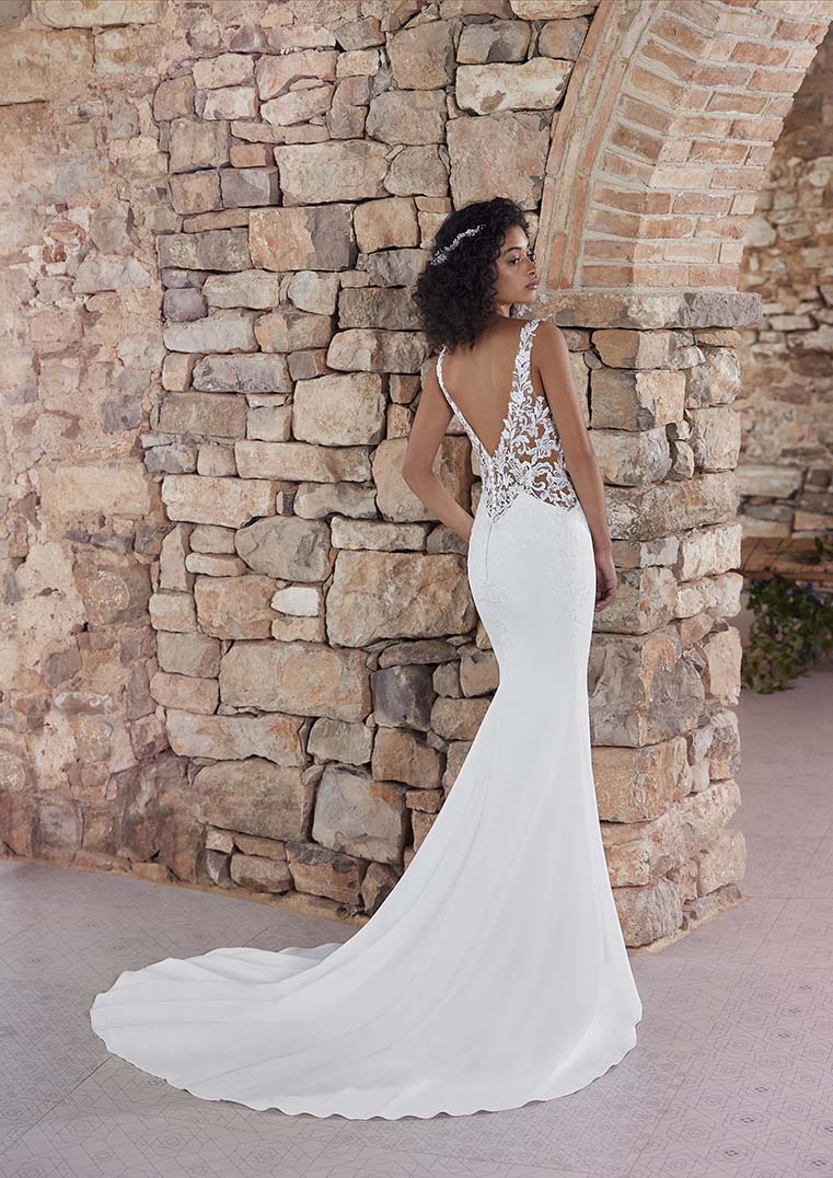 Deze fit and flare jurk van White One van soepelvalled crêpe heeft een prachtig uitgesneden lijfje met een see through rug bedekt met kanten applicaties. Voeg de overrok van tule toe voor een verbluffende uitstraling tijdens de ceremonie en haal deze eraf als je de dansvloer op gaat!