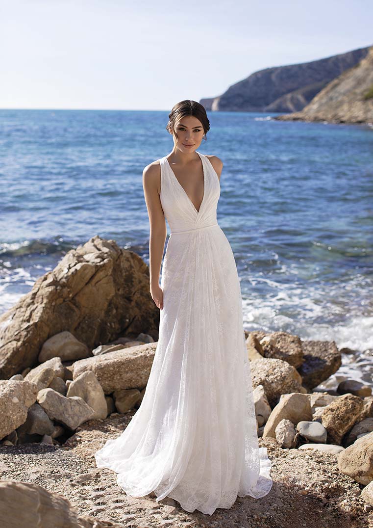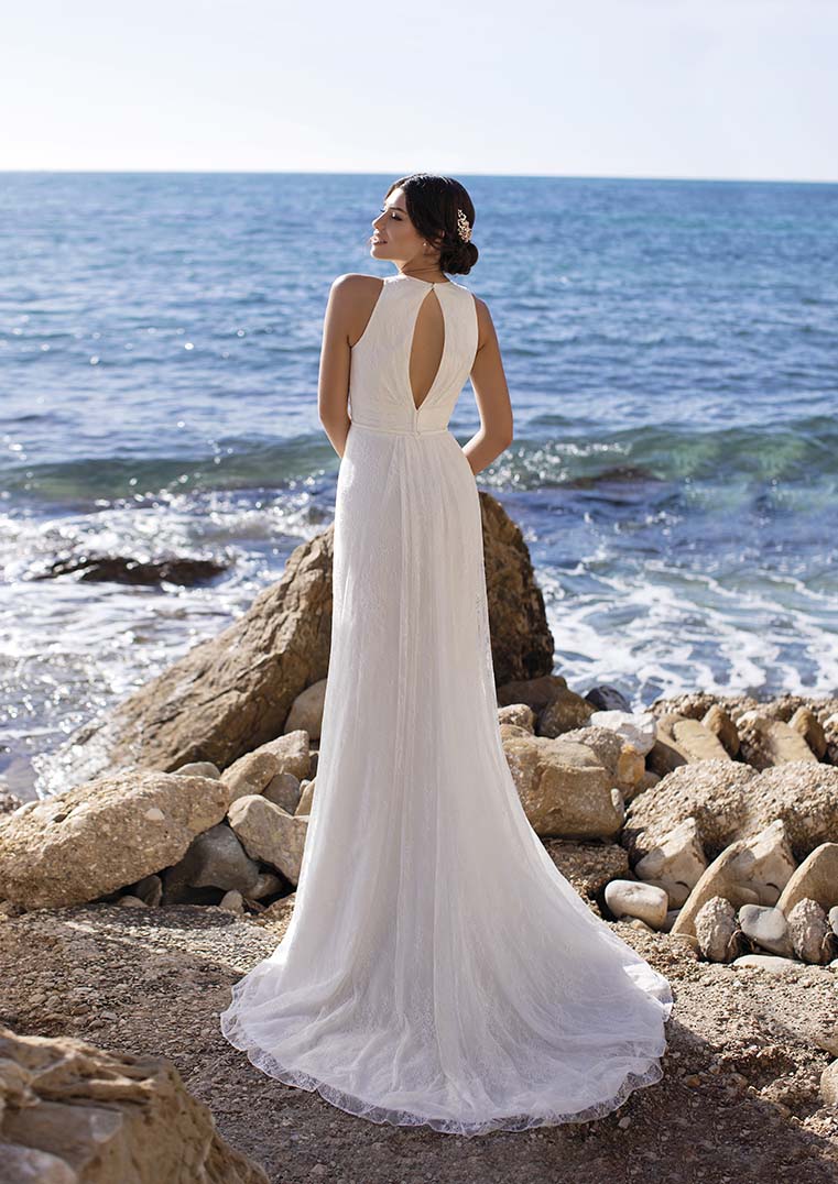Deze Chantilly-kanten jurk straalt de echte bohemian-stijl uit. De Harebell trouwjurk van het merk White One heeft een sensuele V-hals en een sexy keyhole rug. De vloeiende, gerimpelde rok valt romantisch in een kleine sleep. Deze romantische boho trouwjurk is erg geschikt voor een strand bruiloft of tuin feest.