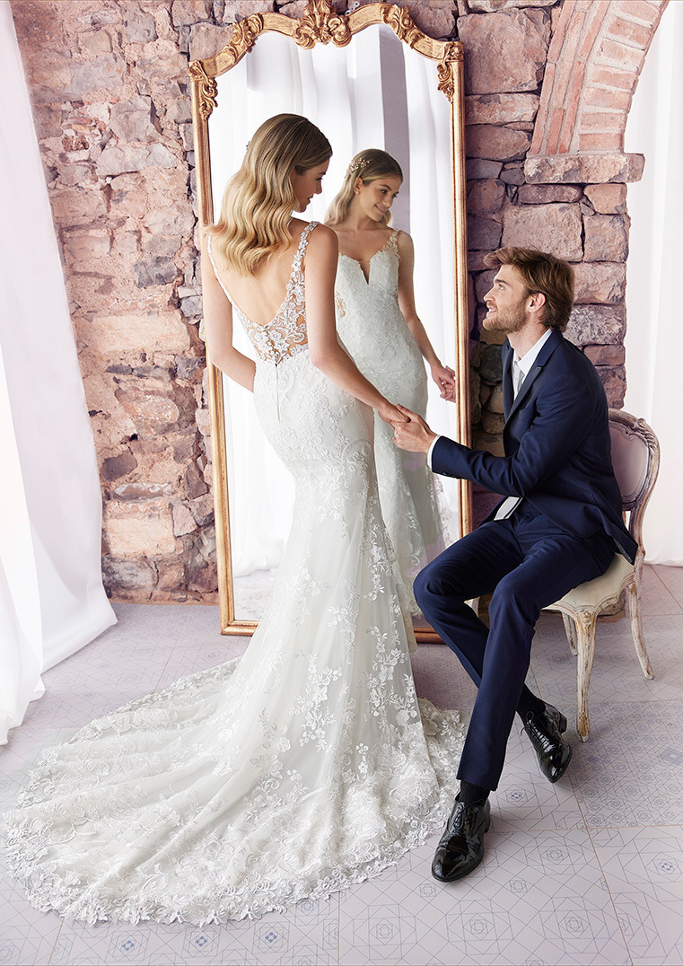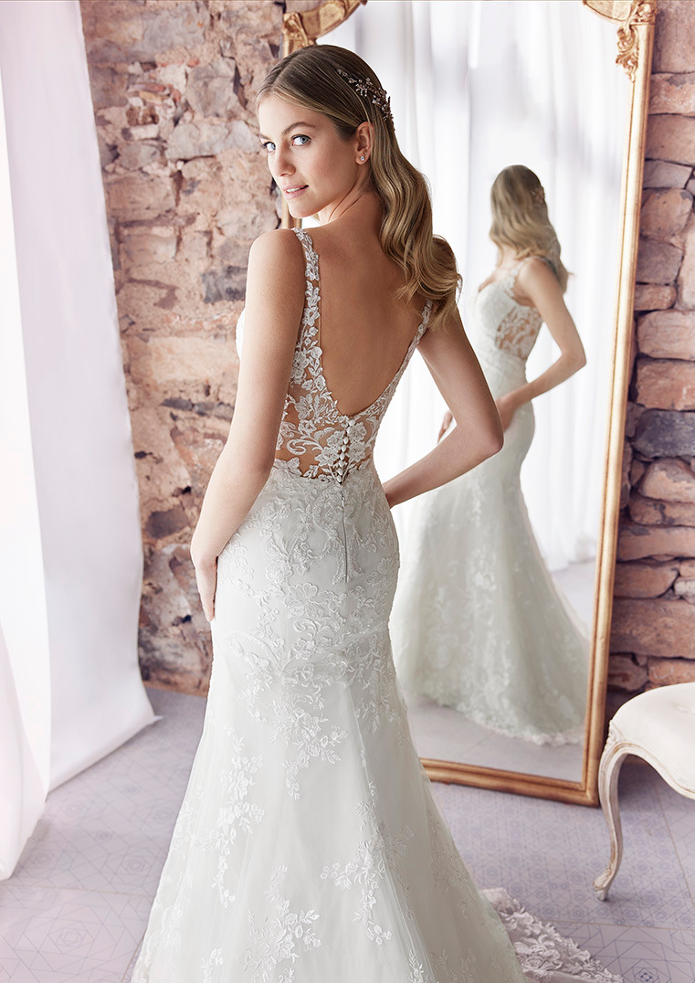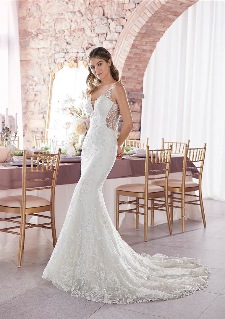 All-over kanten mermaid dress met uitgesneden zijkanten. Een diepe halslijn met illusion bandjes die doorlopen in de lage rug. Verder heeft deze fantastische jurk kant dat helemaal doorloopt en een sexy romantische uitstraling geeft.