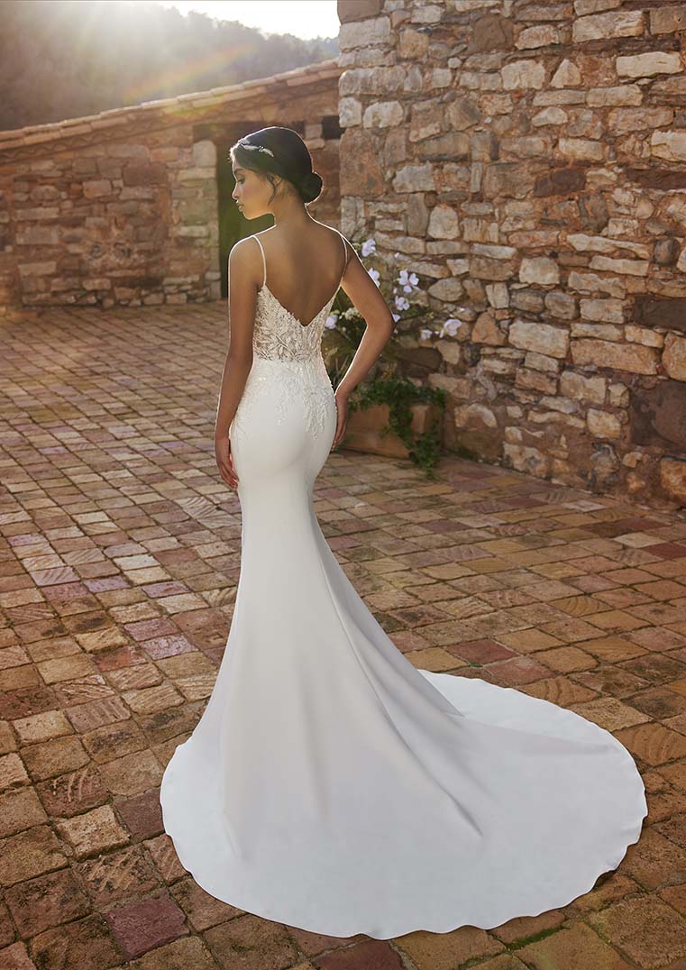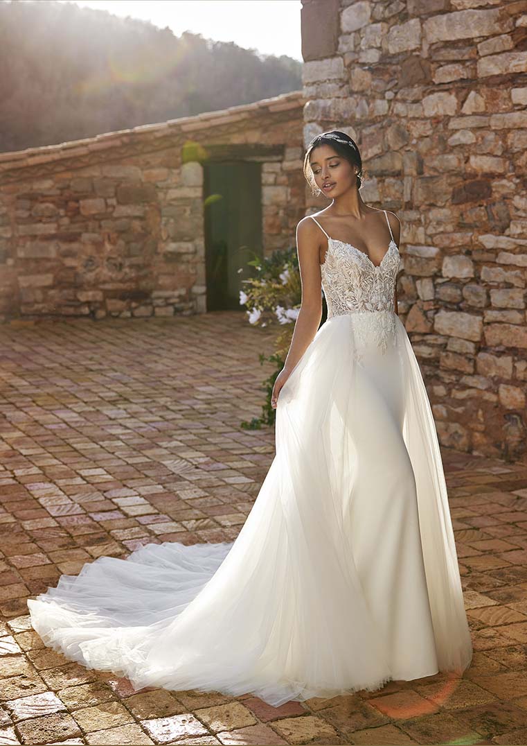 Met deze trouwjurk creëer je twee looks. Kies bijvoorbeeld voor de tule overrok tijdens de cerenomie en laat je rondingen zien op de dansvloer. De elegante zeemeerminrok sluit perfect aan op jouw lichaam. De Shu heeft een chantillykanten lingerielijfje met smalle schouderbandjes en een lage rug.