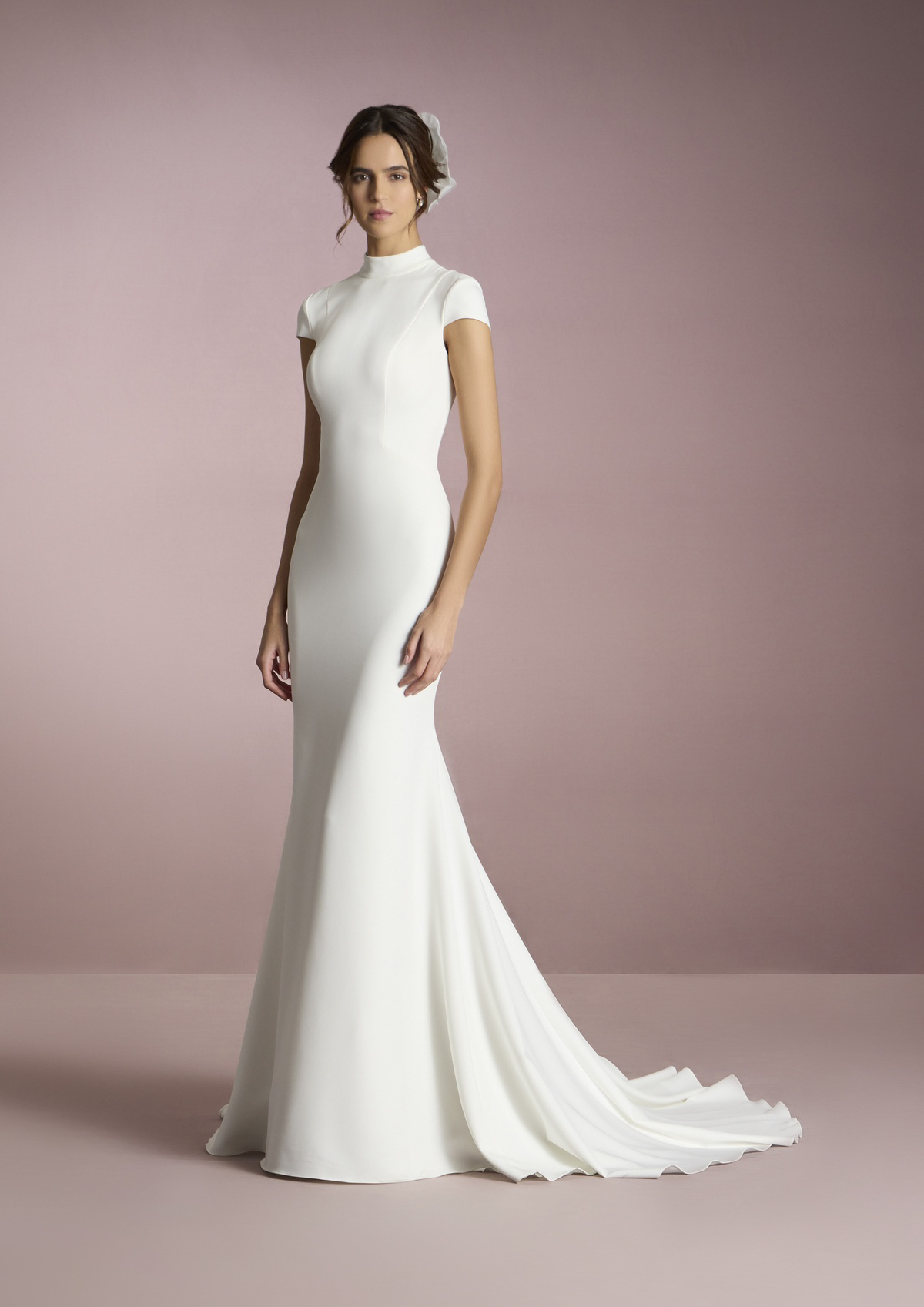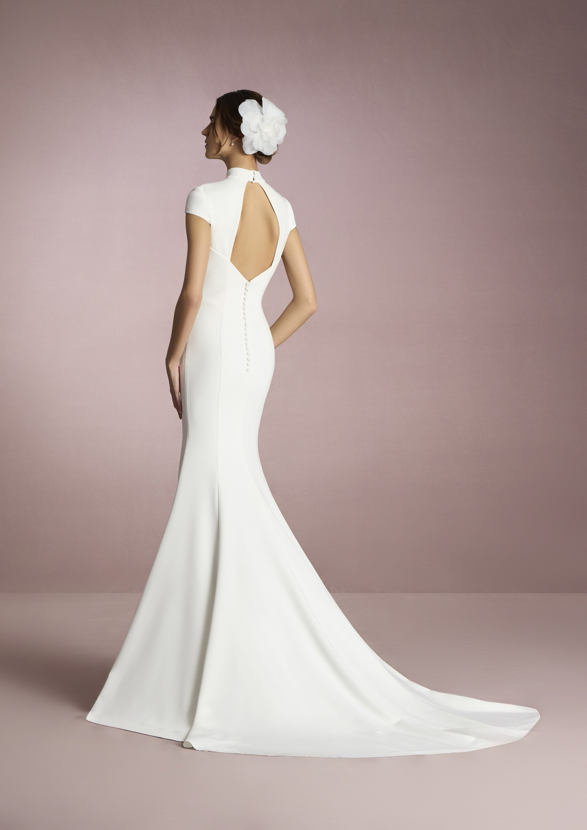 De eenvoudige en elegante TSUBAKI jurk heeft een zeemeerminsilhouet en is gemaakt van crêpe. Enkele van de prachtige details zijn de verfijnde hoge hals, de kapmouwen en de opening op de rug, ook wel een keyhole genoemd.