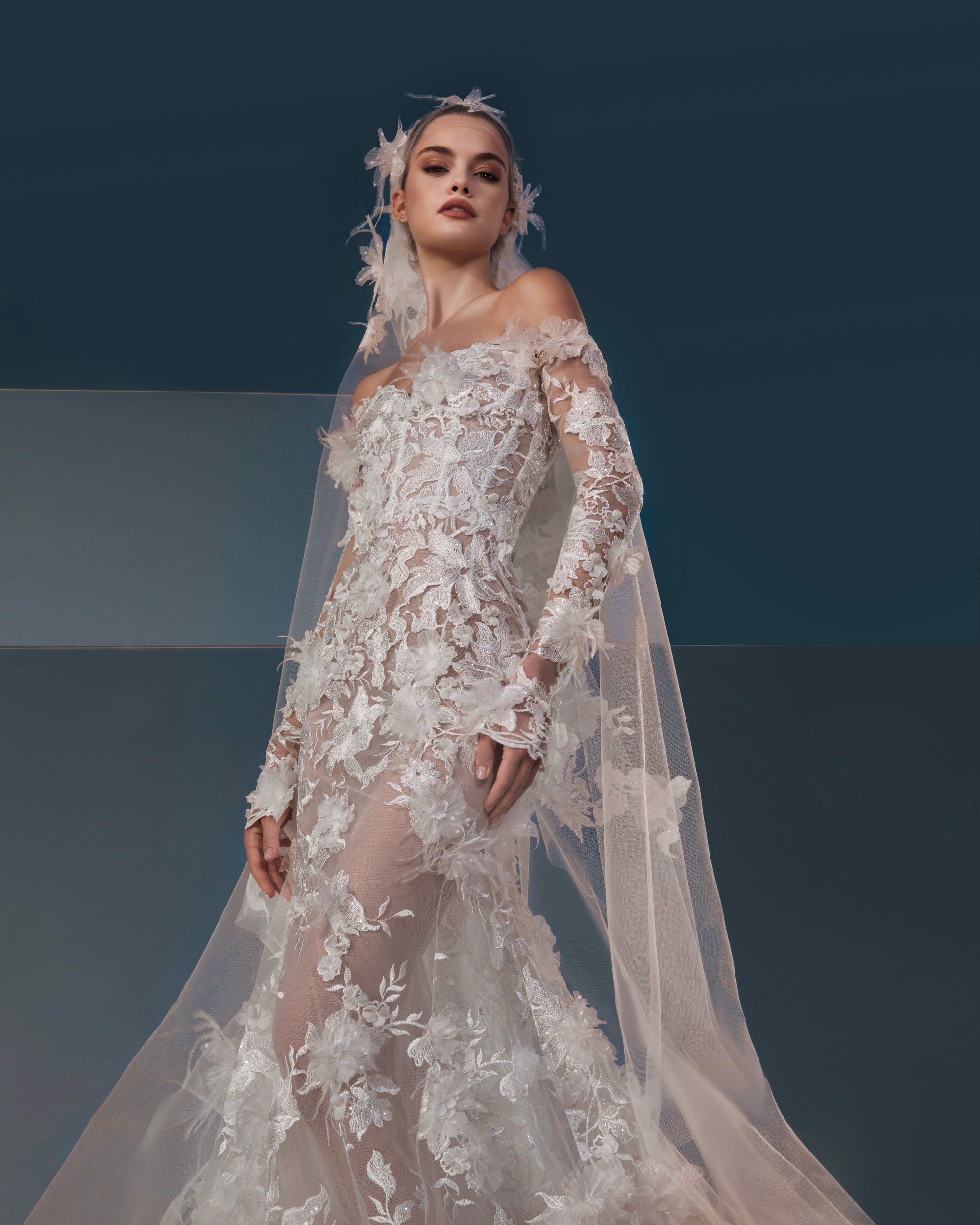 Ontdek de Joanne, een aangesloten off-shoulder trouwjurk vervaardigd van see-through materiaal, versierd met prachtig 3D kant. De Joanne is dé combinatie van sexy en romantisch van de zeer exclusieve Libanese designer Zuhair Murad. De illusie mouwen voegen een vleugje elegantie toe, terwijl het flatterende aangesloten silhouet je figuur prachtig accentueert. Perfect voor een moderne, maar sexy bruidslook. Hier is de Joanne gecombineerd met de bijpassende sluier.