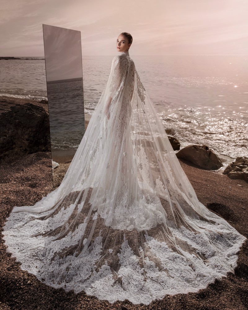 De zeer exclusieve, Libanese designer Zuhair Murad staat bekend om zijn extravagante designs en de mogelijkheden om met één jurk verschillende looks te creëren. Look 9 is dezelfde jurk als look 8, maar hier gecombineerd met een spectaculaire cape die volledig rondom de jurk valt. Zo heb je met één jurk 2 looks in 1. De Jordyn is een aangesloten model gemaakt van see-through materiaal bedekt met kanten applicaties. De halslijn is bijzonder doordat het een haltermodel loopt en een kolletje heeft. Wanneer je dit aandoet zul je zien dat dit je gezicht heel sprekend maakt. Het is een sexy trouwjurk doordat het see-through is. Het is ook een mogelijkheid om deze jurk in het ivoor te laten maken. Hier is het design afgewerkt met een prachtige bijpassende sluier.